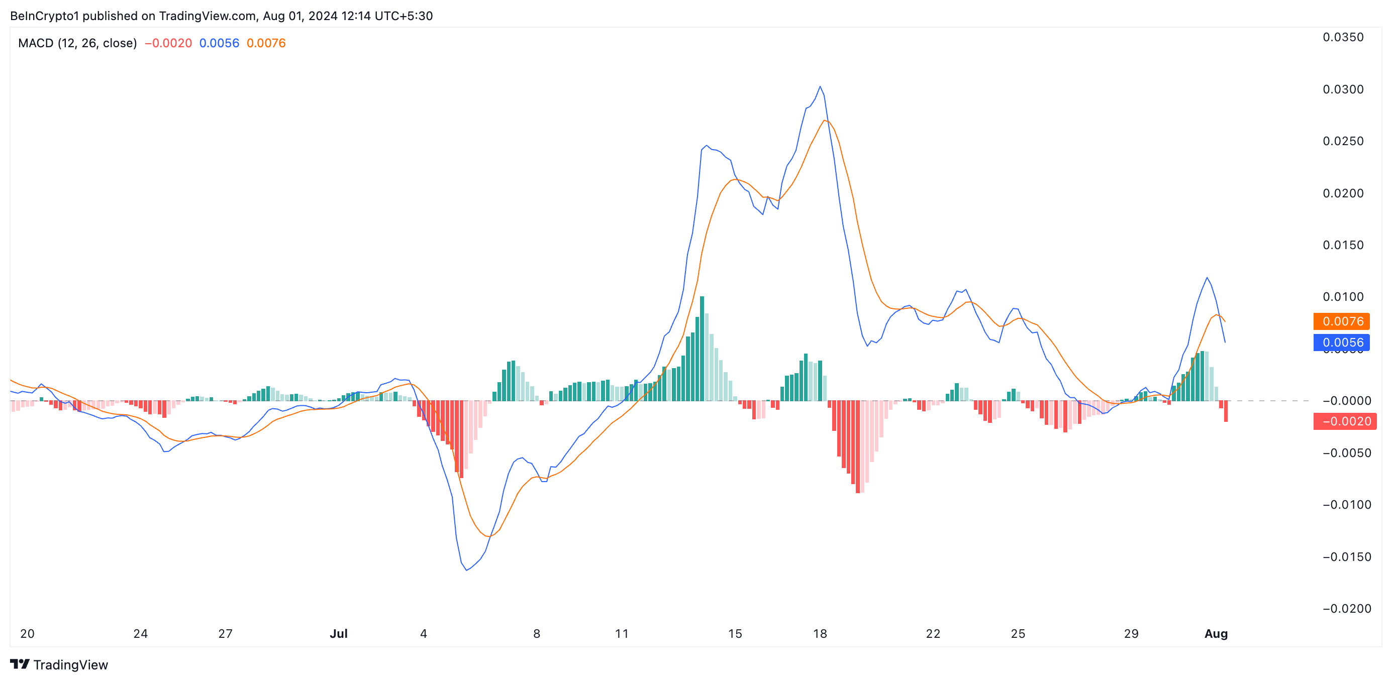 Eine Bewertung der Kursbewegungen von XRP auf einem 4-Stunden-Chart zeigt einen Anstieg der bärischen Tendenz, während der Markt auf das Ergebnis dieses entscheidenden Treffens wartet. Die Ablesungen seines Moving Average Convergence/Divergence (MACD)-Indikators zeigen, dass seine MACD-Linie (blau) unter seine Signallinie (orange) gefallen ist.