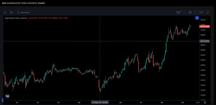 Während die Wale den Verkaufsdruck erhöhten, stieg das XRP Open Interest in dieser Woche. Eine Grafik zeigt, dass das XRP Open Interest am Montag bei 321 Millionen USD lag. Bis zum 29. September ist diese Zahl auf 374 Millionen USD gestiegen.
