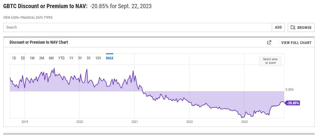 Der Grund dafür ist, dass sich der Preis der Trusts-Aktien nicht an den Bitcoin Kurs gekoppelt, sondern an den Käufen und Verkäufen der Anteile. Da frühere Investor:innen nach dem Bullrun mehr Anteile des Trusts verkauft hatten, als neue Investoren nachgekauft haben, gibt es eine “Prämie” für Investor:innen.