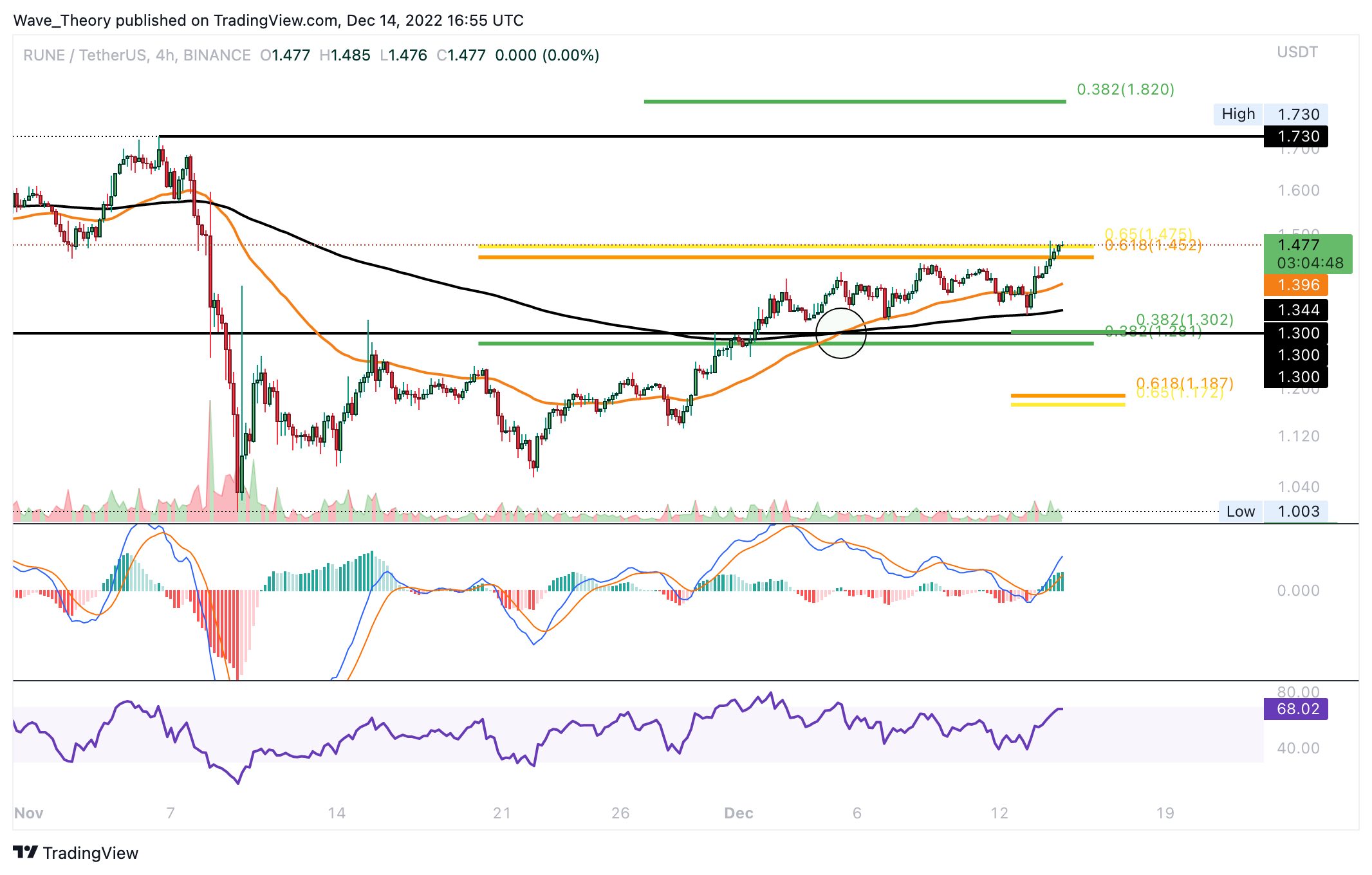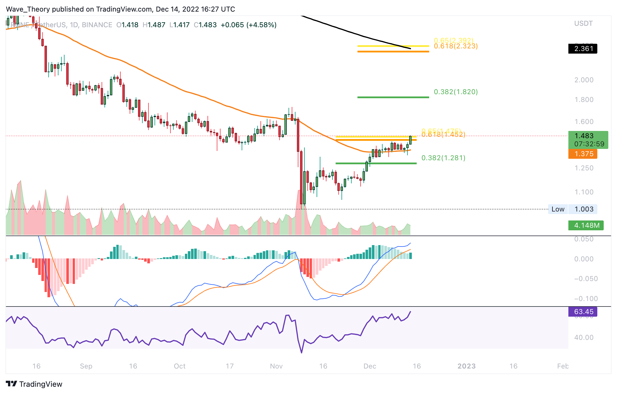 Der RUNE Kurs befindet sich am Golden Ratio Widerstand bei rund 1,45 USD