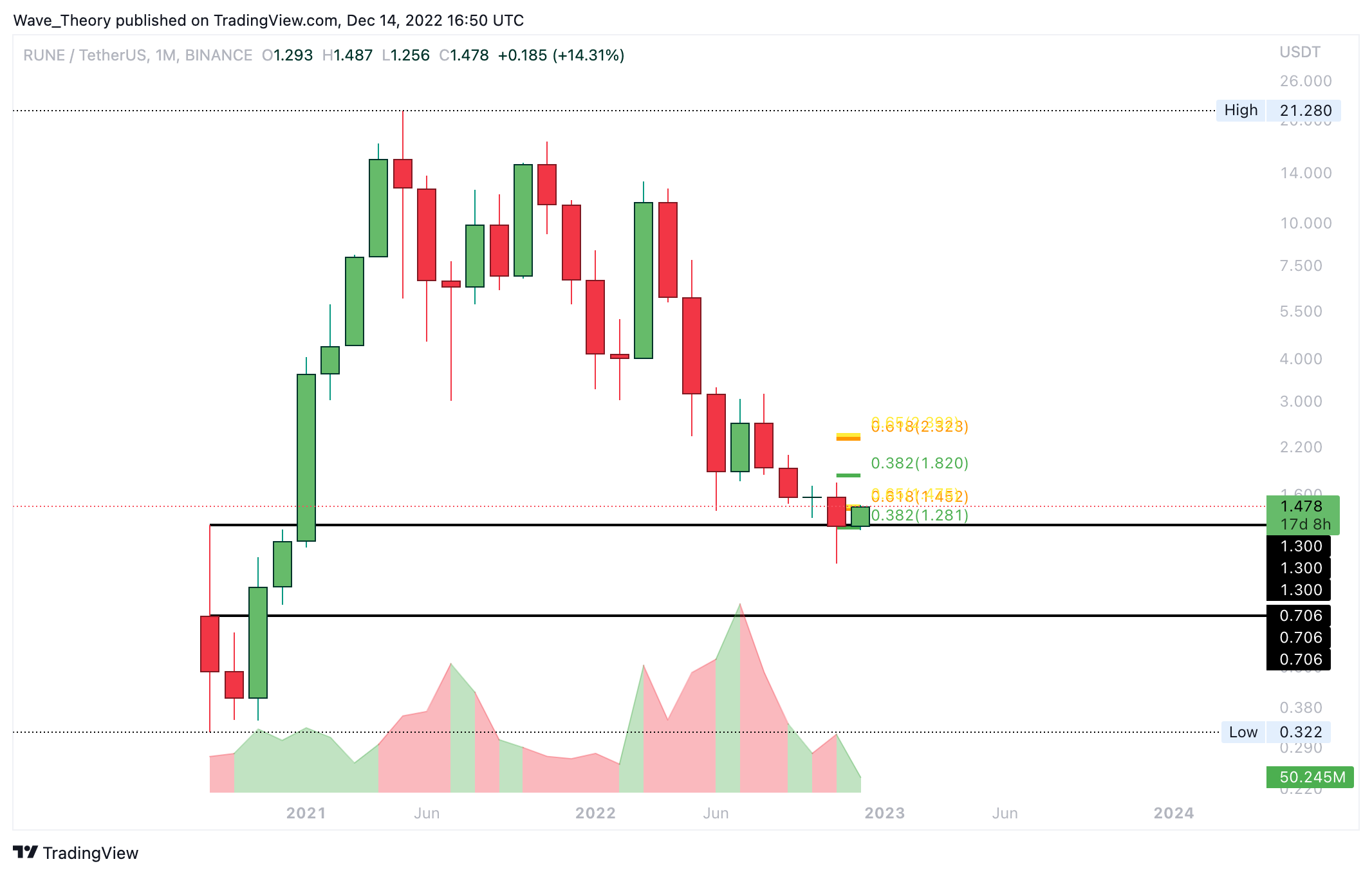 Interessant ist auch, dass das Handelsvolumen in 2022 im Vergleich zum Vorjahr deutlich gestiegen ist. Nach unten hin findet RUNE spätestens zwischen 0,7 USD und 1,3 USD signifikante Unterstützung.