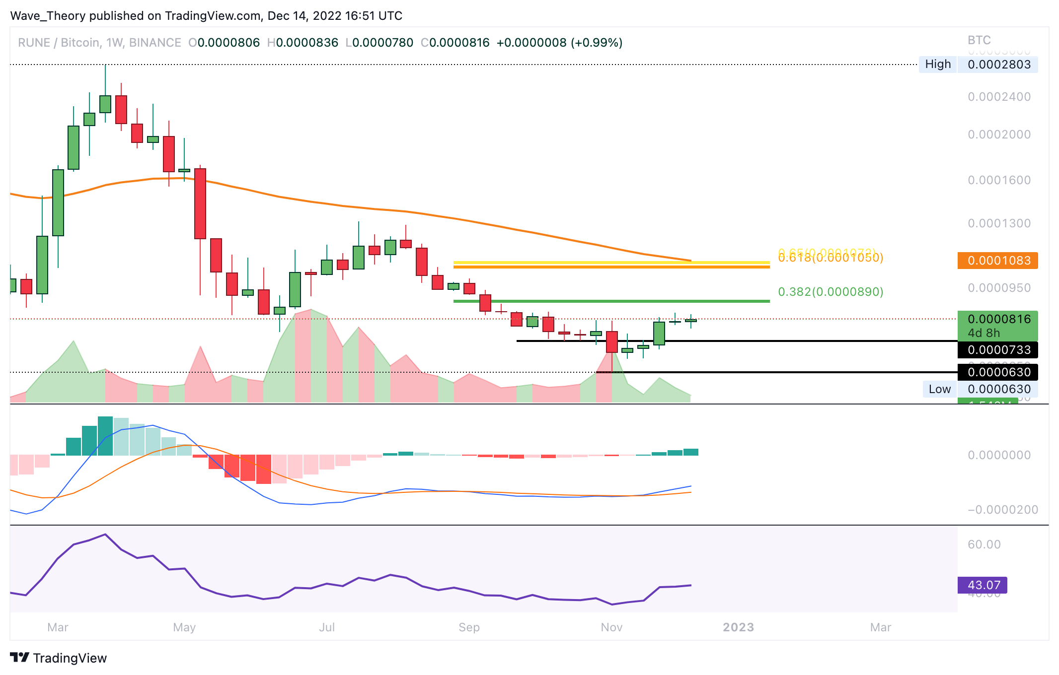 Nach unten hin stößt RUNE zwischen 0,000063 BTC und 0,0000733 BTC auf signifikante Unterstützung. Nach oben hin stößt RUNE bei rund 0,000089 BTC und 0,0000105 BTC auf die nächsten signifikanten Fib Widerstände.