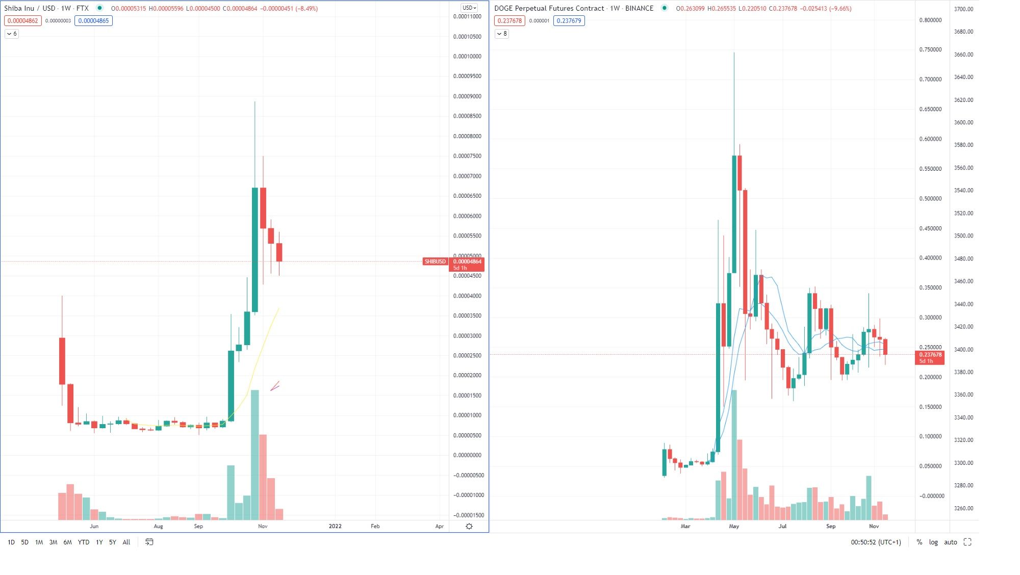 Langfristig gesehen könnte sich der SHIB Kurs wie damals der Dogecoin Kurs entwickeln, wenn der Hype vorbei sein sollte. Dieser erreichte im Mai 2021 nach einem parabolischen das letzte Allzeithoch, fiel anschließend um rund 60% und pendelte sich dann zwischen 0.25 USD und 0.35 USD ein.