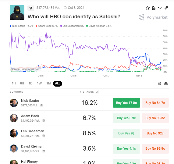 Ein weiterer aus der Liste gestrichener Individuum ist Len Sassaman, der zuvor ein favorisierter Kandidat für Satoshi Nakamoto laut Polymarket-Wettern war. Bis Montag führte Sassaman die Wetten an, doch seine Wahrscheinlichkeit sank, nachdem seine Witwe, Meredith L. Patterson, die Spekulationen dementierte.