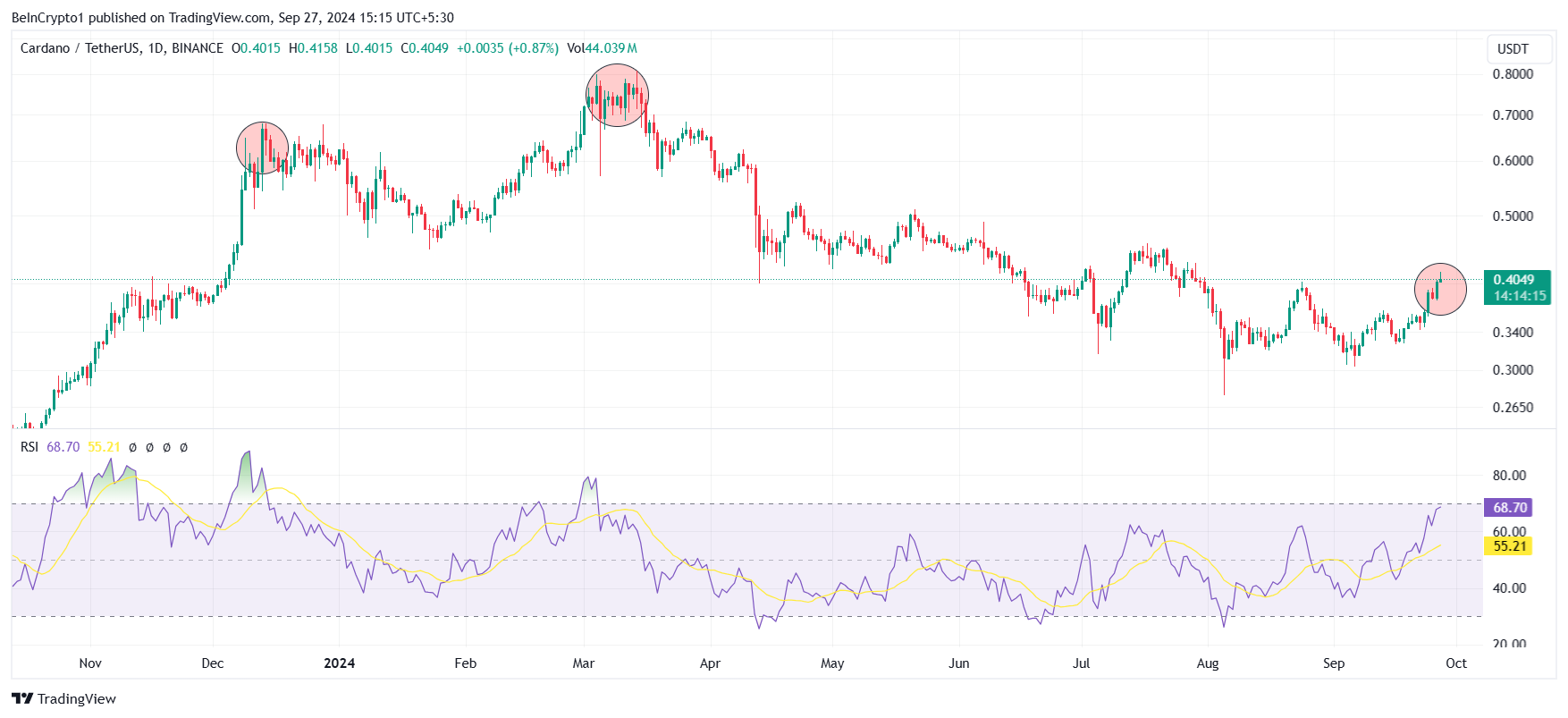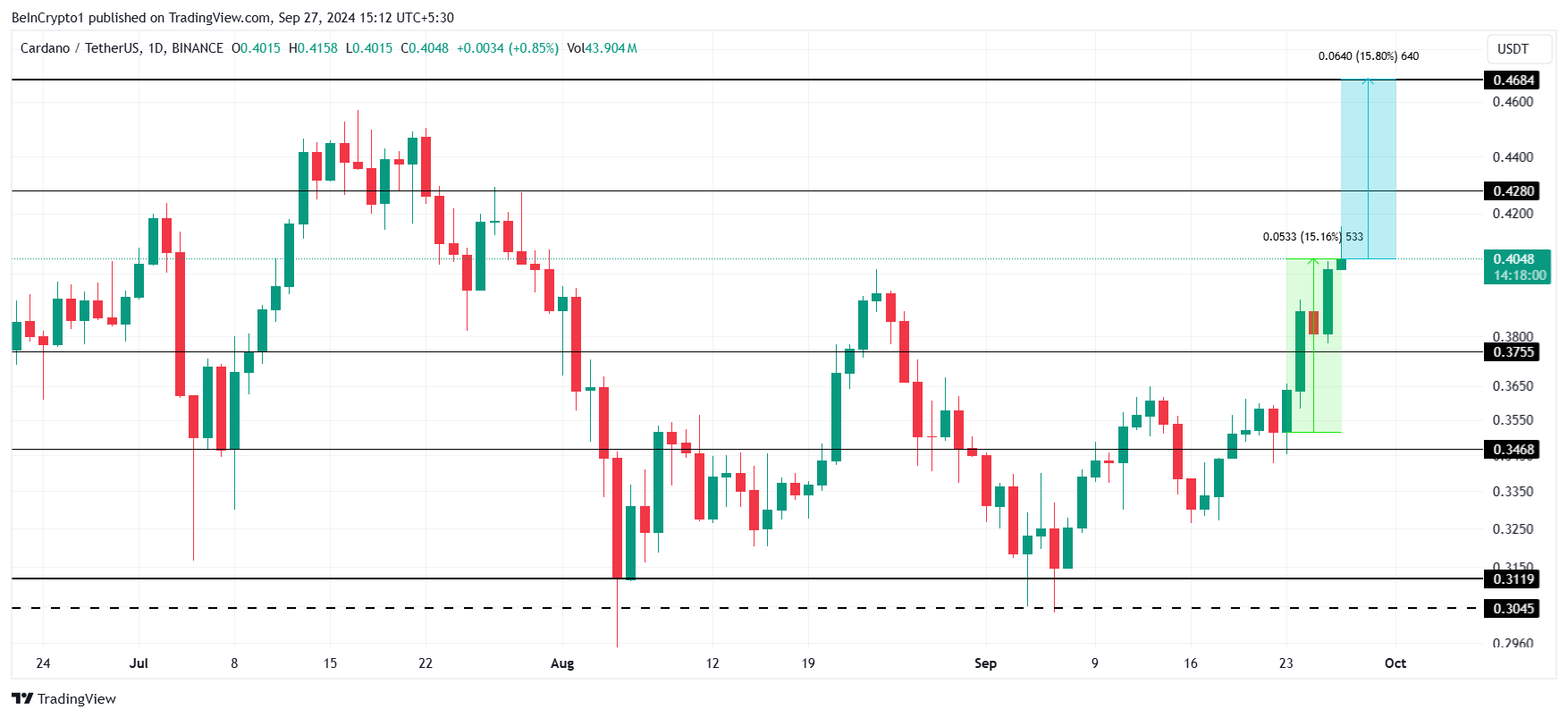 Cardano wird derzeit zu 0,40 USD gehandelt, was einem Gewinn von 15 Prozent in den letzten fünf Tagen entspricht. Der bullische Trend, der Mitte September begann, deutet auf einen möglichen Anstieg auf 0,46 USD hin.