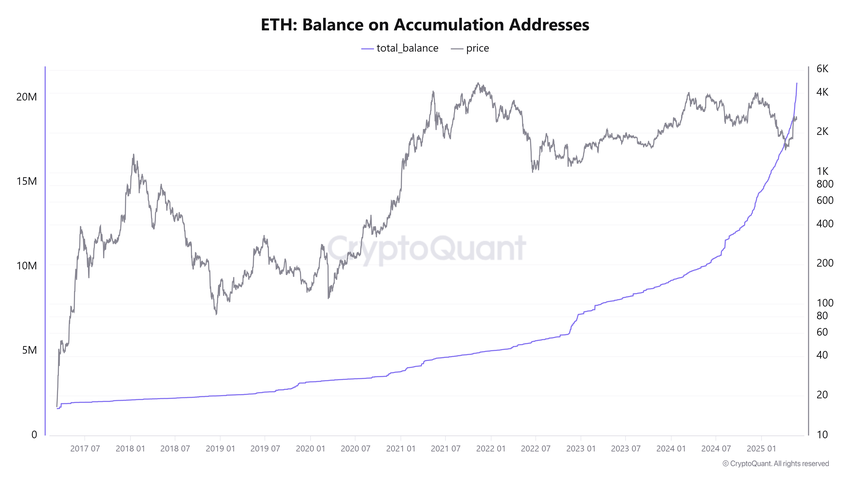 Diese Schritte von Unternehmen wie SharpLink, BioNexus und BTCS spiegeln das wachsende Vertrauen in das langfristige Potenzial von Ethereum wider. Daten von CryptoQuant zeigen, dass dieser Trend die ETH-Bestände in Akkumulations-Wallets auf neue Höchststände getrieben hat — fast 21 Mio. ETH oder 17,5 Prozent des zirkulierenden Angebots.