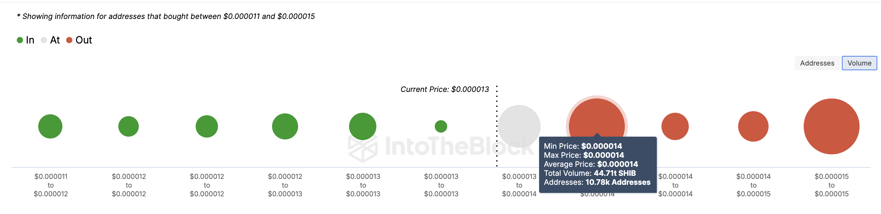 Je größer das Volumen in einem bestimmten Preissegment ist, desto stärker ist die Unterstützung oder der Widerstand auf diesem Niveau. Laut Daten von IntoTheBlock sieht sich SHIB einem erheblichen Widerstand bei 0,000014 USD gegenüber, wo 10.780 Adressen fast 45 Billionen Tokens halten.