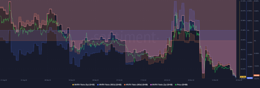 Der Marktwert von SHIB verglichen mit dem realisierten Wert (MVRVs) zeigt, dass längerfristige Shiba Inu-Anleger sich aktuell im Minus befinden. Die SHIB MVRVs für fünf bzw. zwei Jahre sowie die für 180 bzw. 90 Tage ergeben allesamt Verluste für die Anleger und unterstreichen damit ihre schmerzhaften Erfahrungen.
