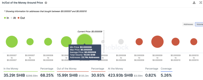 SponsoredLaut dem In/Out-of-Money Indikator von IntoTheBlock könnte die Marke von 0,000008 US-Dollar vorerst als starke Unterstützung dienen. Hier halten 23.740 Wallets insgesamt 16,04 Billionen SHIB.