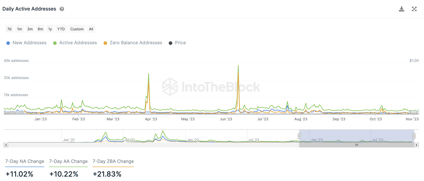 Die Anzahl an neuen Shiba Inu Adressen ist in den letzten sieben Tagen um rund 11% gestiegen. In derselben Zeit konnte die Anzahl aktiver SHIB Adressen um rund 10 % wachsen. Die Anzahl an Adressen ohne SHIB Guthaben ist dabei um fast 22 % gestiegen.