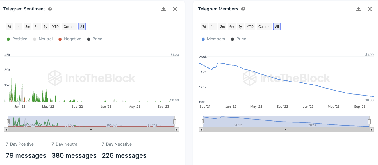 Die Mitgliederzahl der Shiba Inu Telegram Gruppe zeigt einen massiven Rückgang. Auch die Stimmung auf Telegram hat sich massiv verschlechtert.