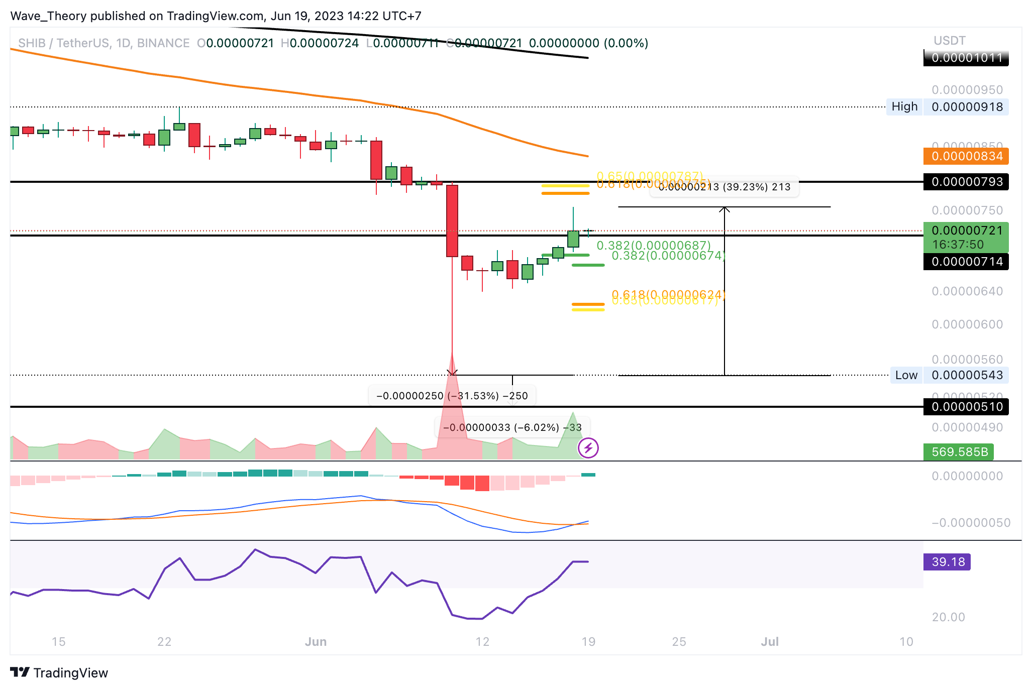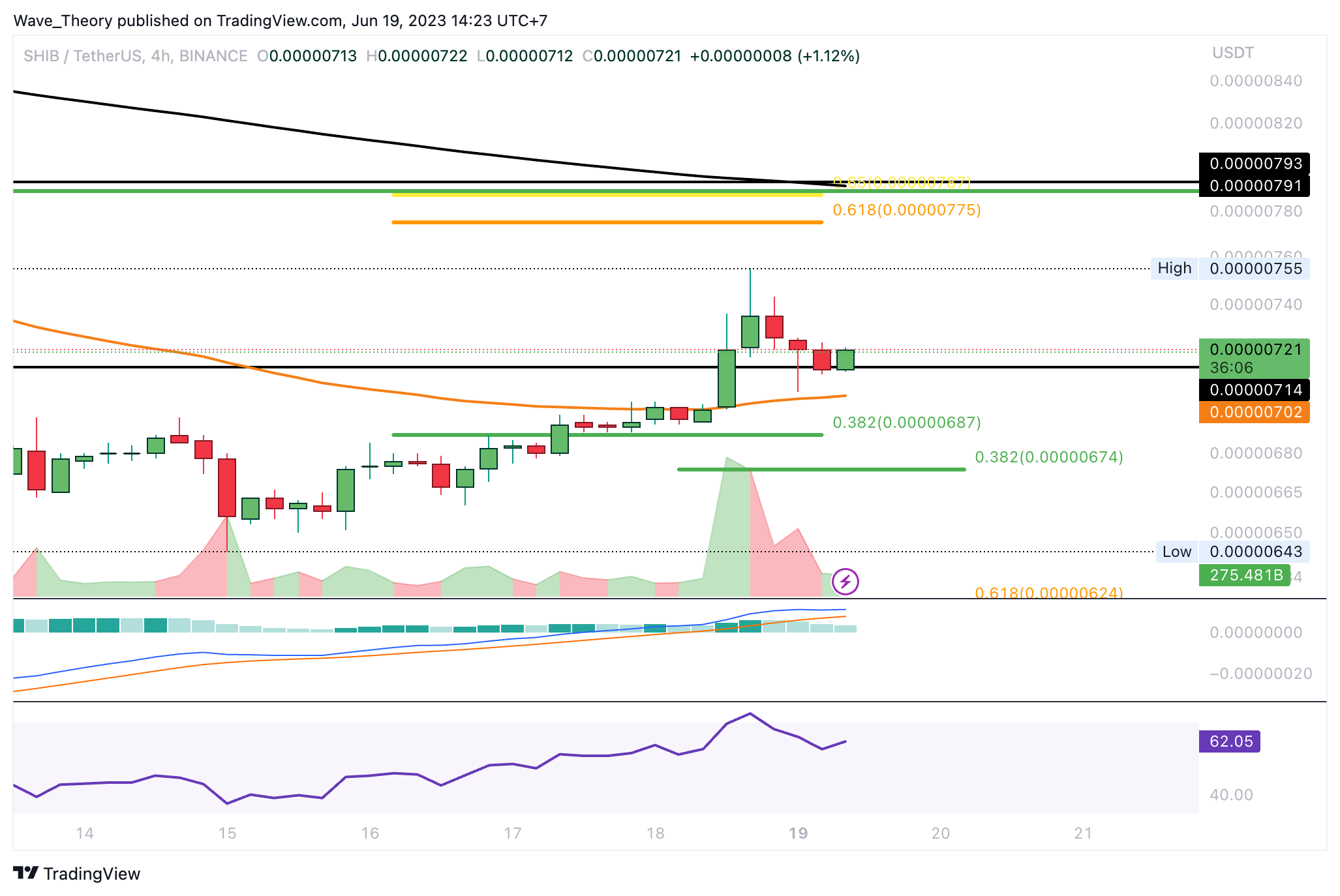 Die Unterstützung bei rund 0,0000051 USD verfehlte der Shiba Inu Coin dabei um rund 6 %. Seither ist der Kurs aber bereits wieder über 39 % im Kurs gestiegen. Dabei konnte Shiba Inu sogar bereits den 0,382 Fib Widerstand bei rund 0,00000687 USD brechen. Damit wartet jetzt bei rund 0,0000078 USD der nächste signifikante Fib Widerstand.