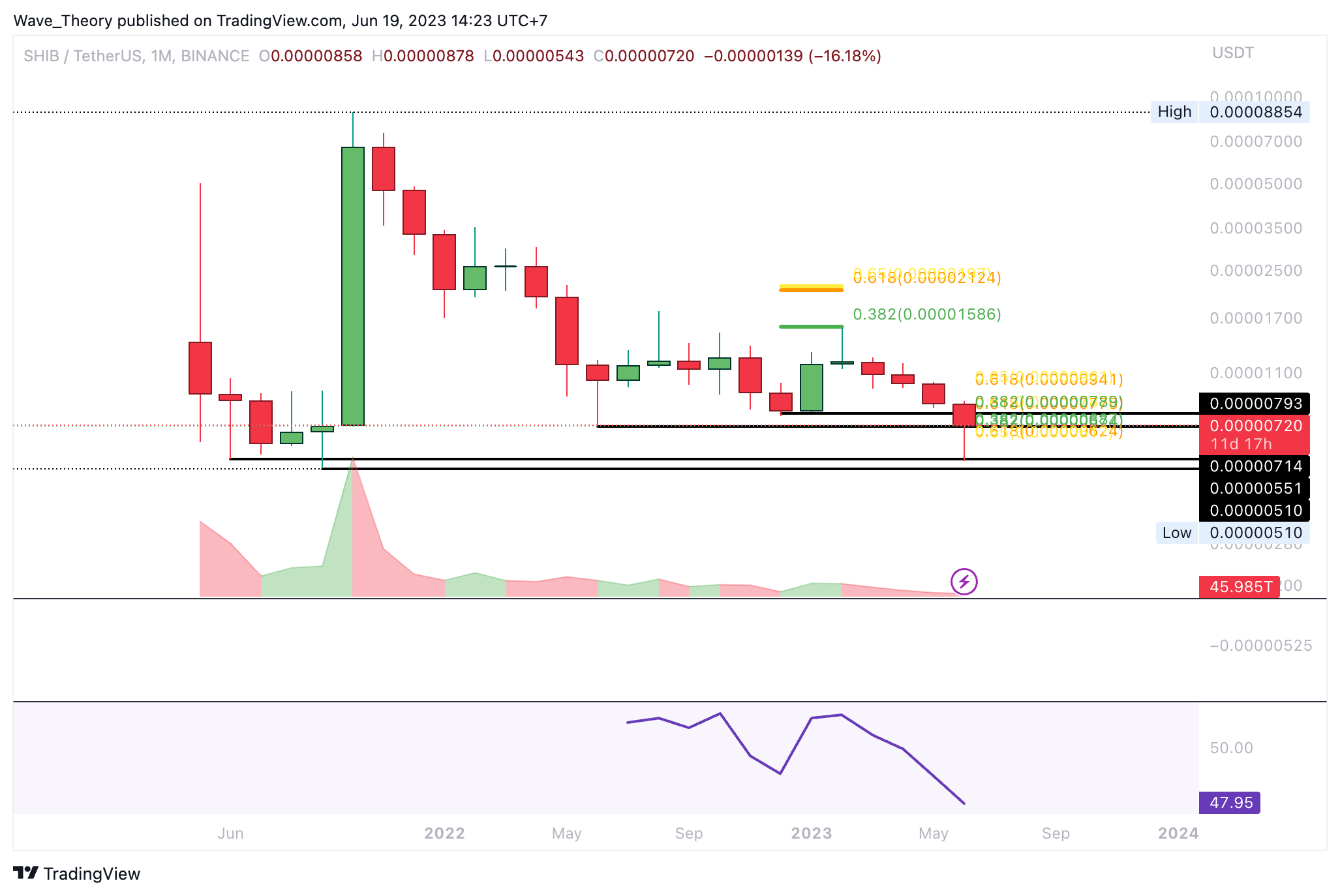Im Monatschart sieht es eher schlecht aus. Denn zwischen rund 0,0000051 USD und 0,0000055 USD liegt die letzte Unterstützung, bevor Shiba Inu ein neues Tief erreichen könnte. Bisher prallt der Kurs aber gut nach oben ab. Entscheidend ist jetzt, ob Shiba Inu den Golden Ratio Widerstand bei rund 0,0000096 USD brechen kann.