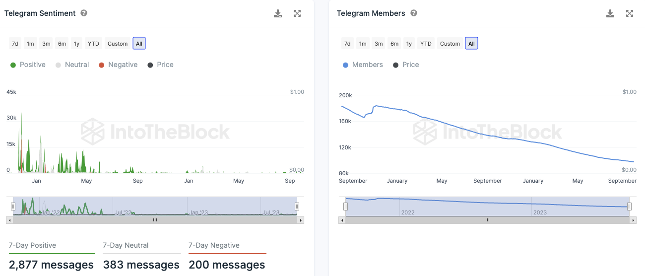 Bei der Anzahl an Telegram Migliedern der Shiba Inu Telegram Gruppe liegt ein starker Abwärtstrend vor. Die Stimmung auf Telegram ist zu Shiba Inu aber extrem positiv. So stehen 2.877 positive Nachrichten zu Shiba Inu 200 negativen Nachrichten gegenüber.