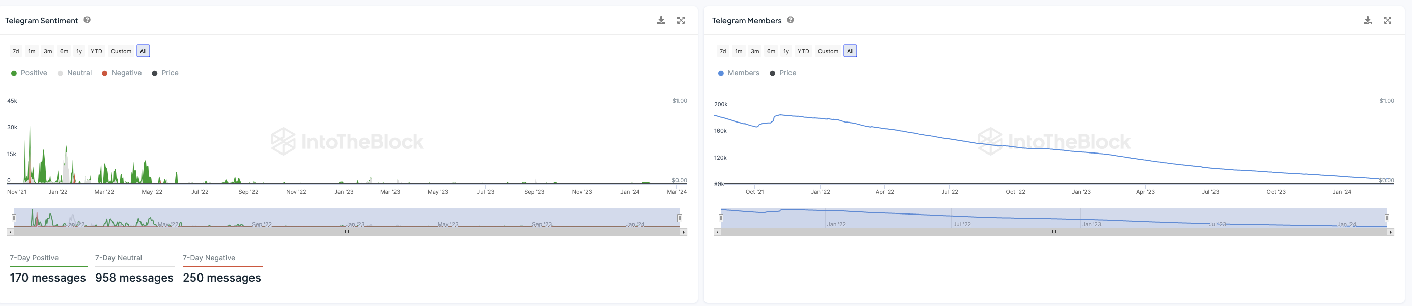 Die Stimmung auf Telegram gegenüber Shiba Inu zeigt einen deutlichen Abwärtstrend, mit einem Überschuss an negativen Nachrichten im Verhältnis zu positiven Beiträgen. Auch die Telegram-Gruppe befindet sich in einem Abwärtstrend.