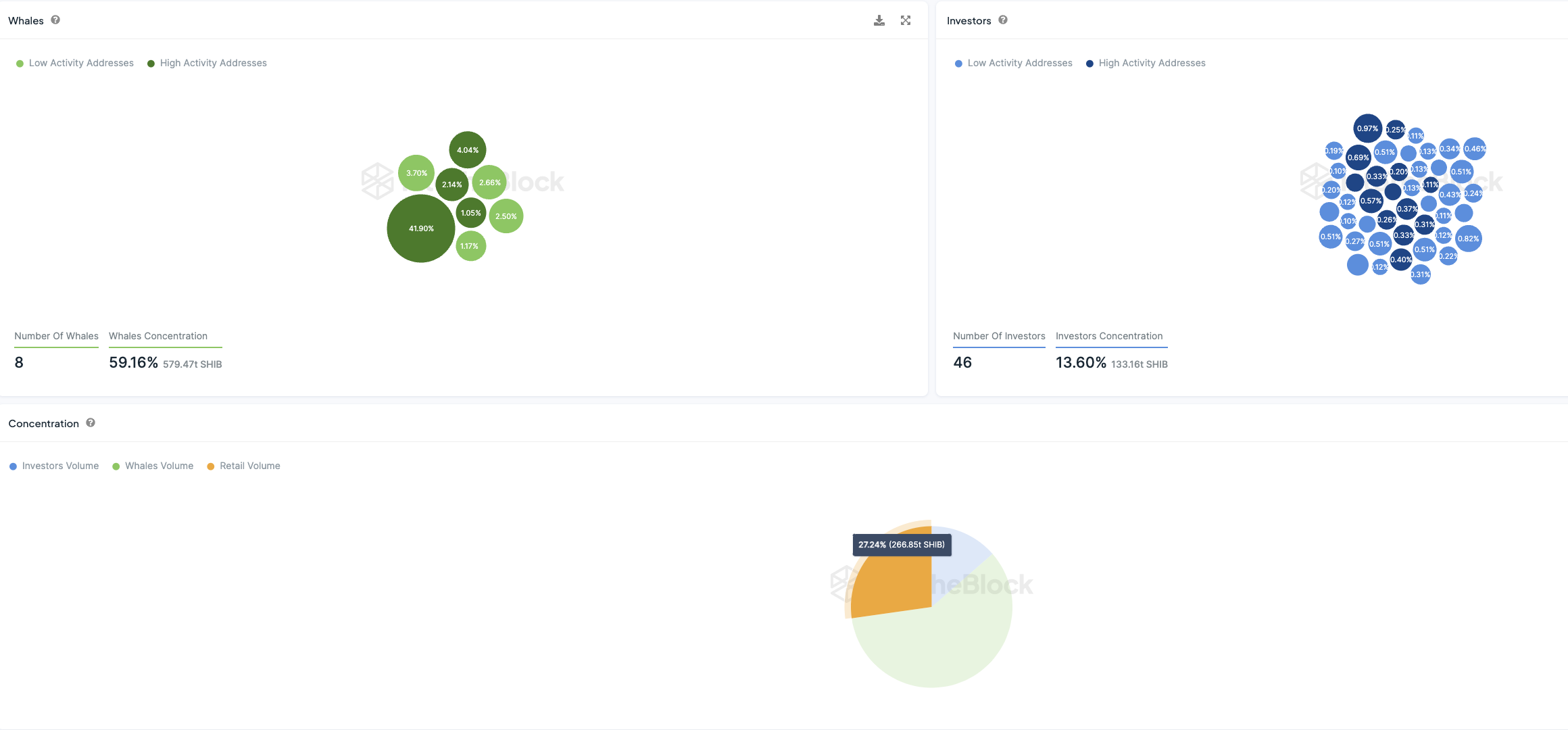 So halten rund 46 institutionelle Anleger:innen knapp ein Viertel der im Umlauf befindlichen SHIB Tokens. 7 Wal Adressen halten dabei fast die Hälfte der Token.