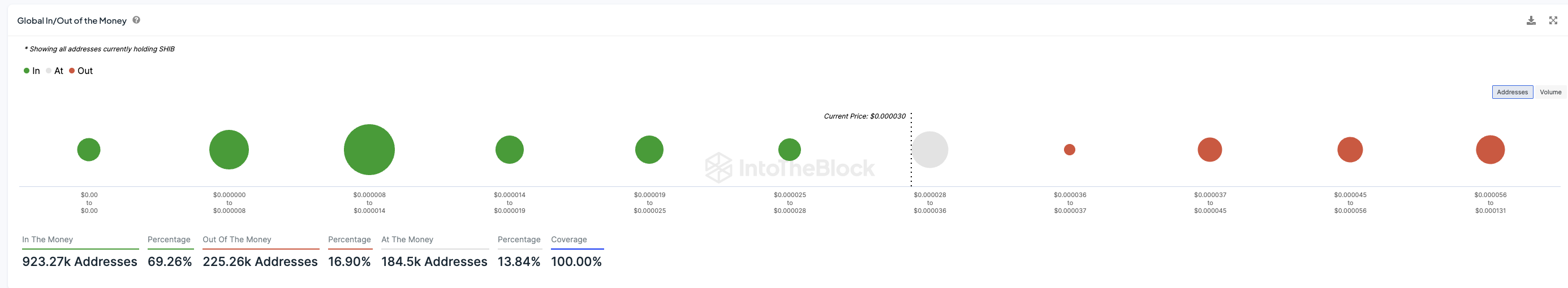 Es sind nur noch rund 17 % der Shiba Inu Adressen im Minus. Fast als 70 % würden beim Verkauf ihrer SHIB Token einen Gewinn machen und ein verhältnismäßig großer Anteil von rund 13,84 % würde weder einen Gewinn noch einen Verlust verzeichnen.