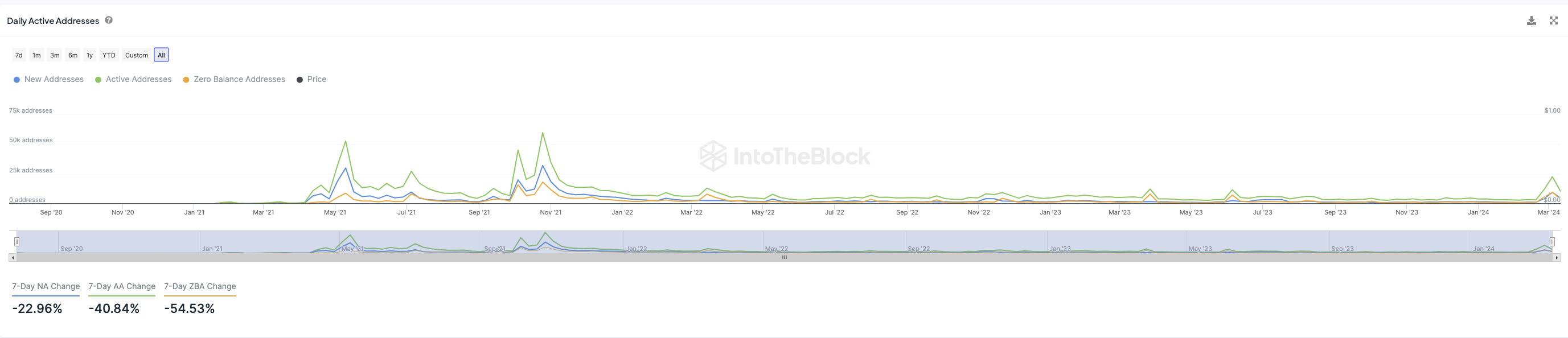 Jedoch ist die Aktivität im Shiba Inu Netzwerk deutlich gesunken. So lag in den letzten sieben Tagen ein Abfall von rund 23 % an neuen Adressen vor. Die Anzahl an aktiven Adressen ist dabei sogar um rund 41 % gefallen.