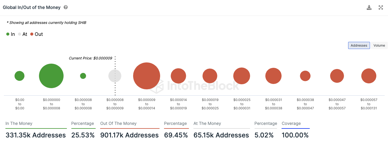 Mittlerweile sind über 25 % der Shiba Inu Adressen im Plus. Rund 69,5 % der SHIB Adressen schreiben dabei immer noch rote Zahlen und rund 5 % befinden sich am Break-even Punkt. Das bedeutet, diese Adressen würden beim Verkauf ihrer SHIB Token weder einen Gewinn noch einen Verlust verzeichnen.
