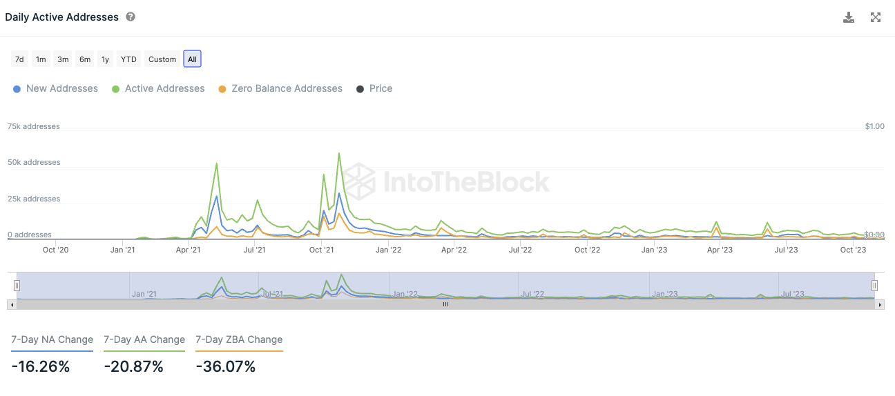 Die Anzahl an neuen Shiba Inu Adressen ist in den letzten sieben Tagen um rund 16,3 % gefallen. In derselben Zeit ist die Anzahl aktiver SHIB Adressen um rund 21 % zurückgegangen. Die Anzahl an Adressen ohne SHIB Guthaben ist dabei sogar um 36 % geschrumpft.