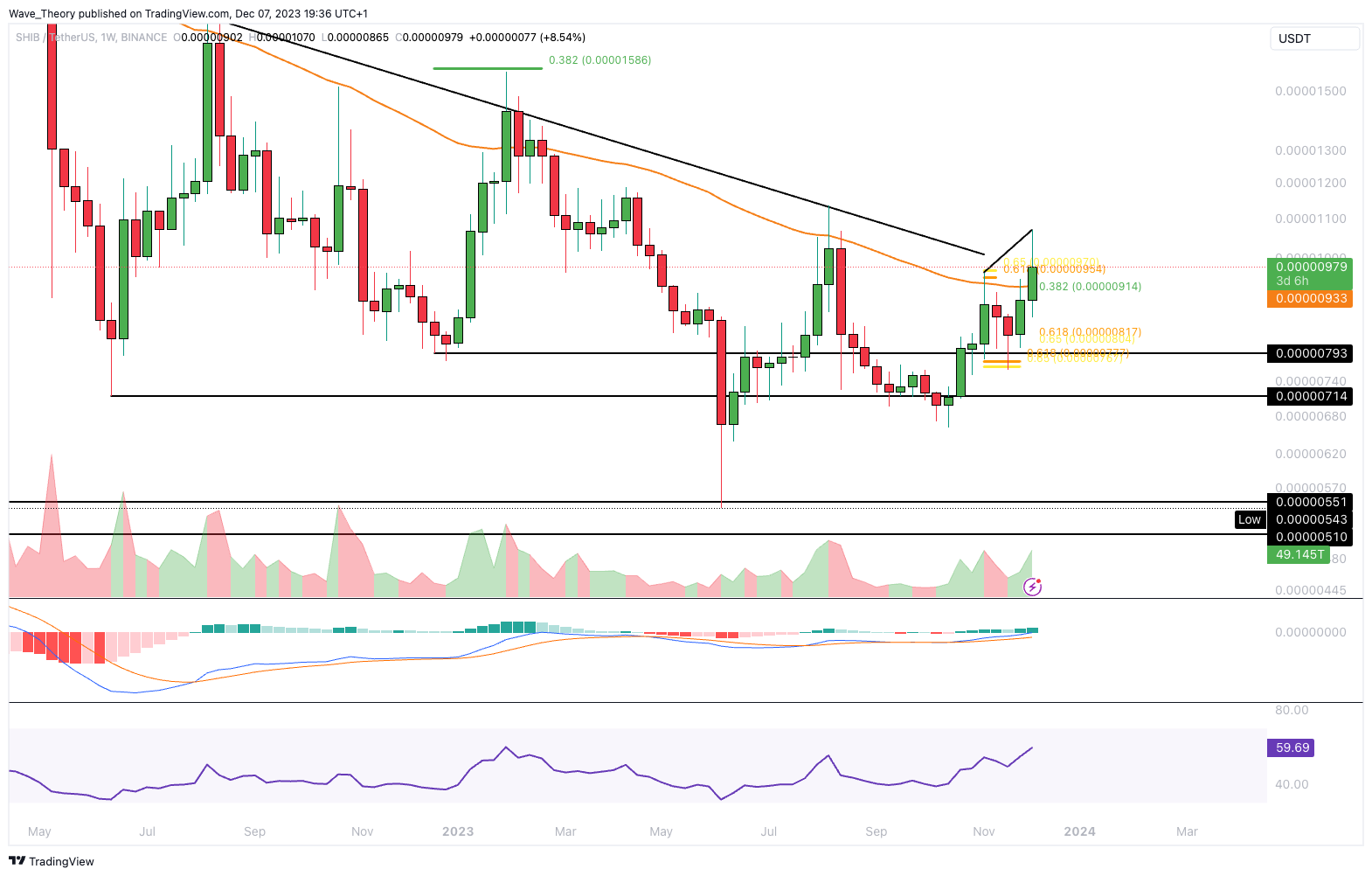 Der RSI bewegt sich dabei in neutralem Territorium und gibt weder bullische noch bärische Signale. Darüber hinaus scheint der Shiba Inu Kurs in dieser Woche den 50-Wochen-EMA Widerstand bei rund 0,00000933 USD zu brechen.