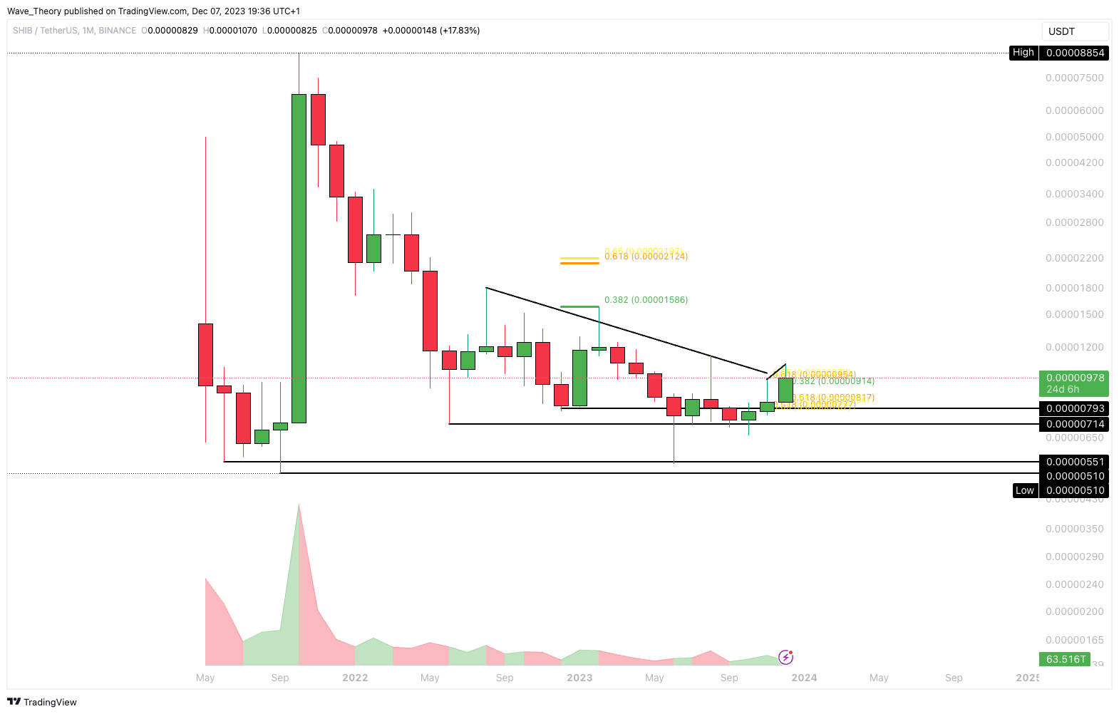 Das wäre ein bullischer Anfang. Als Nächstes könnte der SHIB Kurs die bärische Trendlinie anvisieren.
