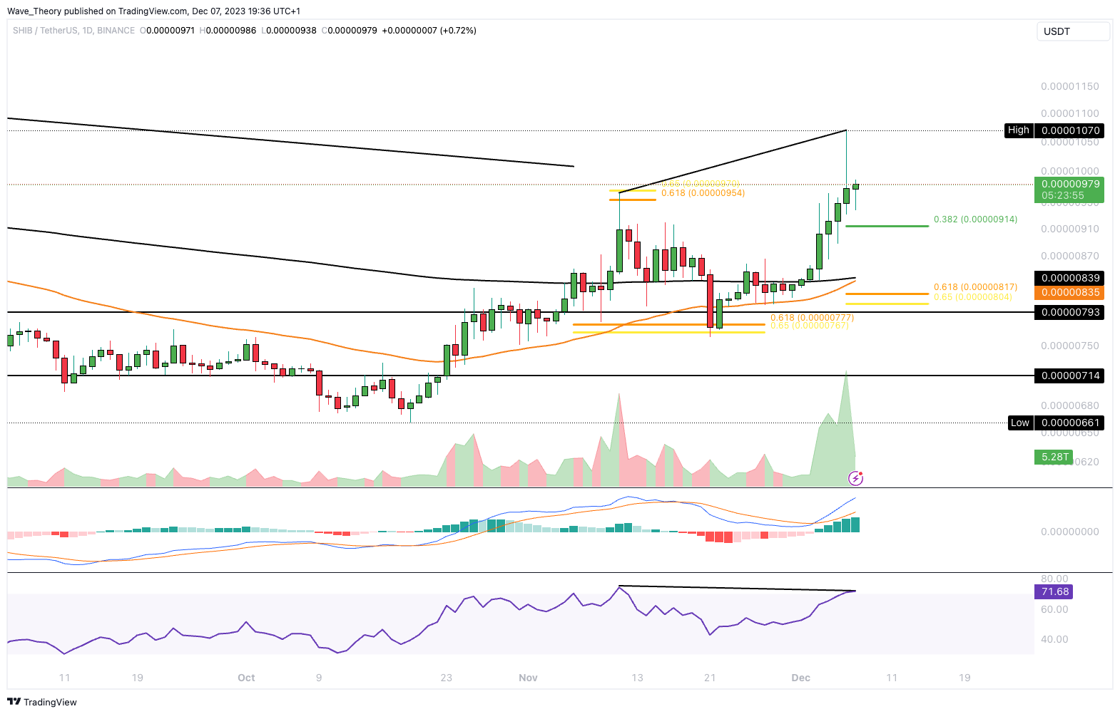 Zwar konnte Shiba Inu gestern kurzfristig den Golden Ratio Widerstand bei rund 0,0000095 USD deutlich übersteigen. Doch mit dem höheren Hoch hat der RSI eine bärische Divergenz im Tageschart geformt.