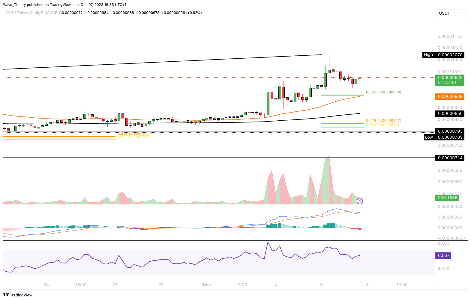 Der Shiba Inu Coin befindet sich erneut am Golden Ratio Widerstand bei rund 0,0000095 USD