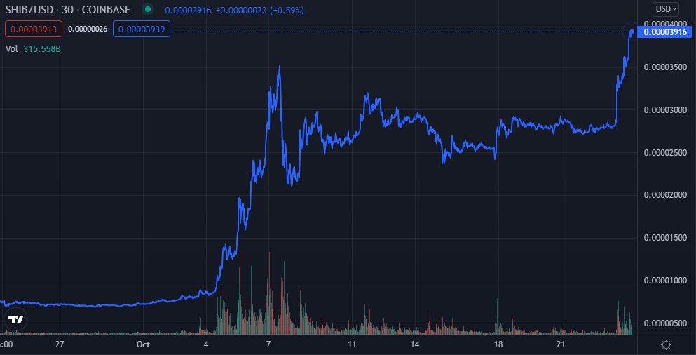 Aber auch abseits der bullischen Nachrichten, gibt es positive Entwicklungen zu beobachten. Seit Anfang des Monats Oktober befindet sich der Shiba Inu Coin in einer Rallye, die in einem neuen Allzeithoch gipfelte. Mit einem SHIB Preis von 0,00003376 US-Dollar sehen wir hier nun neue Höchstzahlen.