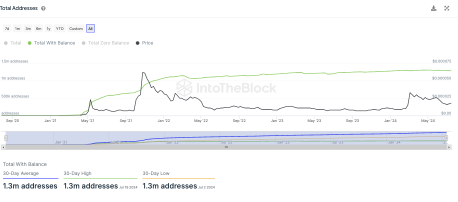 Das Wachstum der Gesamtanzahl an Shiba Inu Adressen mit SHIB Guthaben befindet sich nach wie vor in einer Stagnationsphase. In den letzten 30 Tagen wurden im Durchschnitt 1,3 Millionen Shiba Inu Adressen mit einem SHIB Guthaben gezählt.