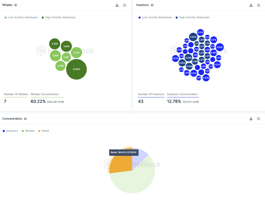 Konkret halten etwa 43 institutionelle Investoren rund 21,6 % der umlaufenden SHIB Tokens. Sieben Wale-Adressen kontrollieren dabei rund ein Drittel der sich im Umlauf befindlichen SHIB Token.