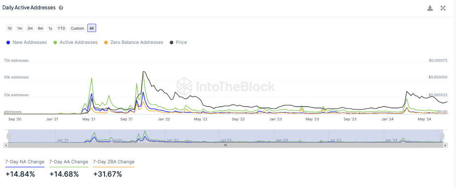 Die Aktivität im Shiba Inu Netzwerk geht derzeit wieder nach oben. So stieg der Anteil an neuen Adressen um knapp 14,84 %, wohingegen der Anteil an aktiven Adressen um rund 14,7 % gestiegen ist.