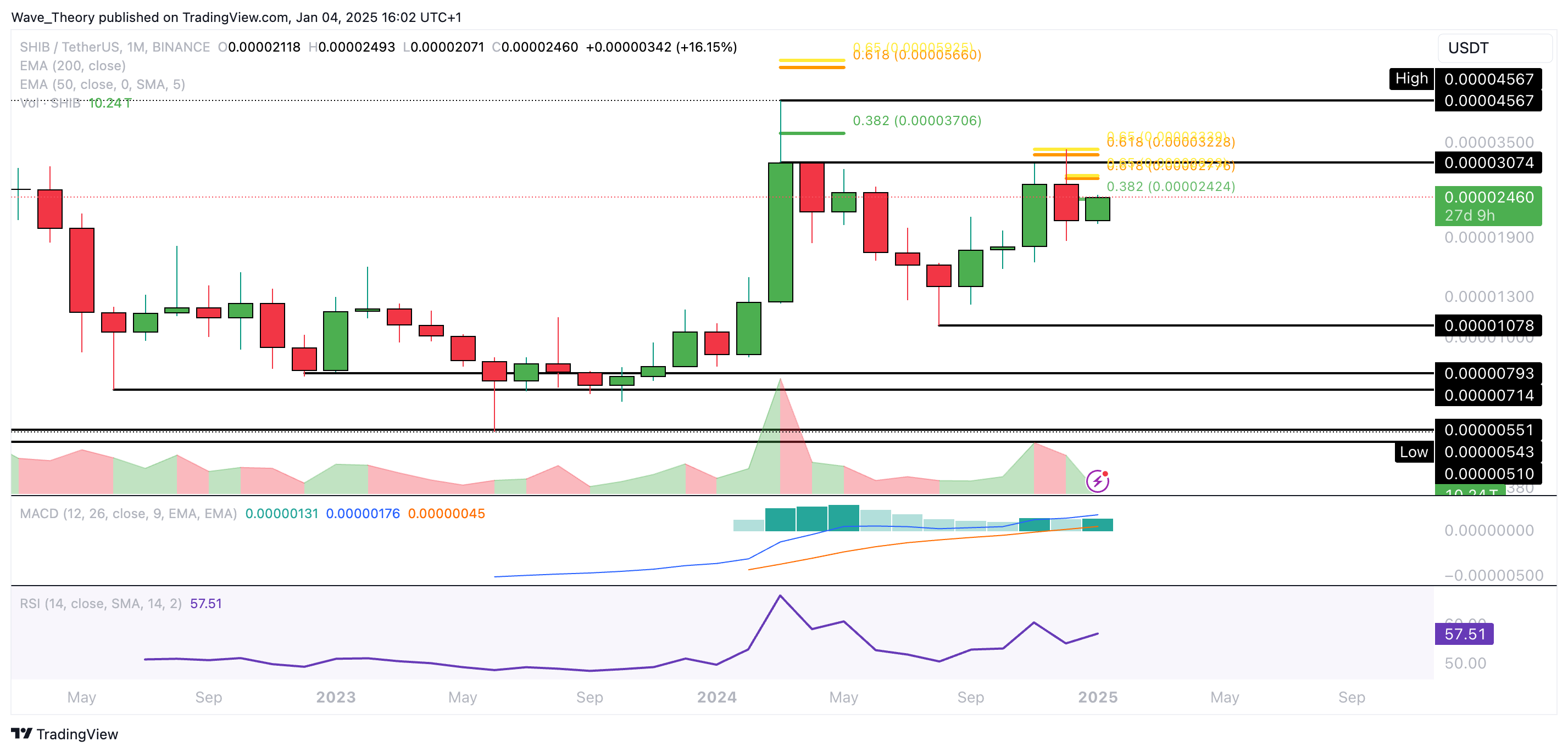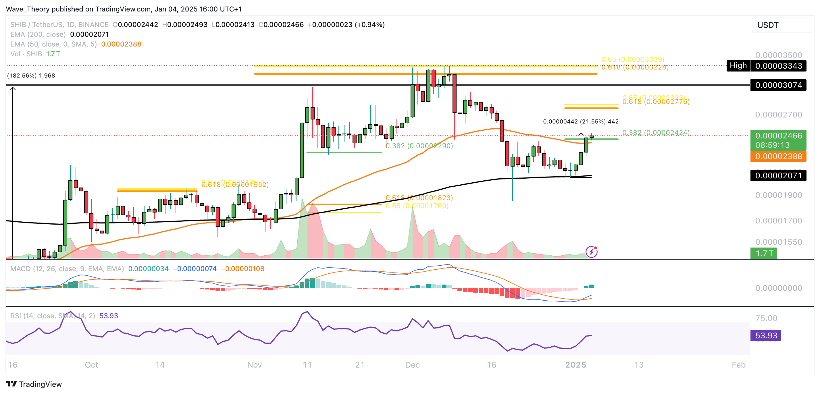 Dort angekommen, konnte der SHIB Kurs bullisch abprallen. Seither ist der Kurs rund 21,5 % gestiegen. Dabei hat Shiba Inu jetzt den 50-Tage-EMA und das 0,382 Fib Niveau bei rund 0,00002388 USD überwunden.
