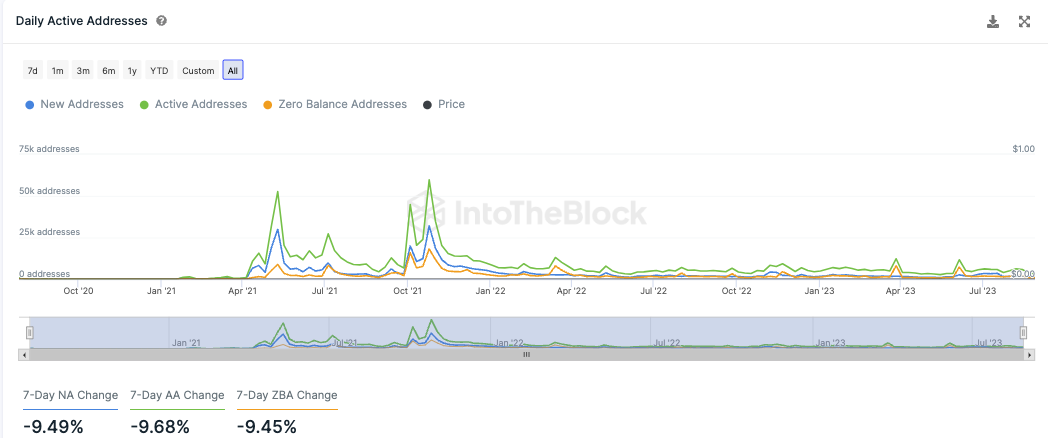 Die Anzahl an neuen Adressen, aktiven Adressen und Adressen ohne SHIB Guthaben ist in den letzten sieben Tagen zwischen rund 9,5 % und 9,7 % gesunken.