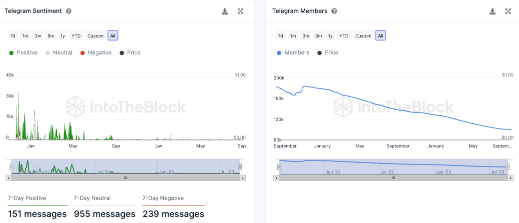 Bei der Anzahl an Telegram Nutzern der Shiba Inu Telegram Gruppe liegt ein starker Abwärtstrend vor. Zudem wird die Stimmung auch deutlich schlechter. Mittlerweile liegen fast doppelt so viele negative Telegram Nachrichten zu Shiba Inu vor wie positive. Denn in den letzten sieben Tagen standen 239 negative knapp 151 positiven Nachrichten gegenüber.
