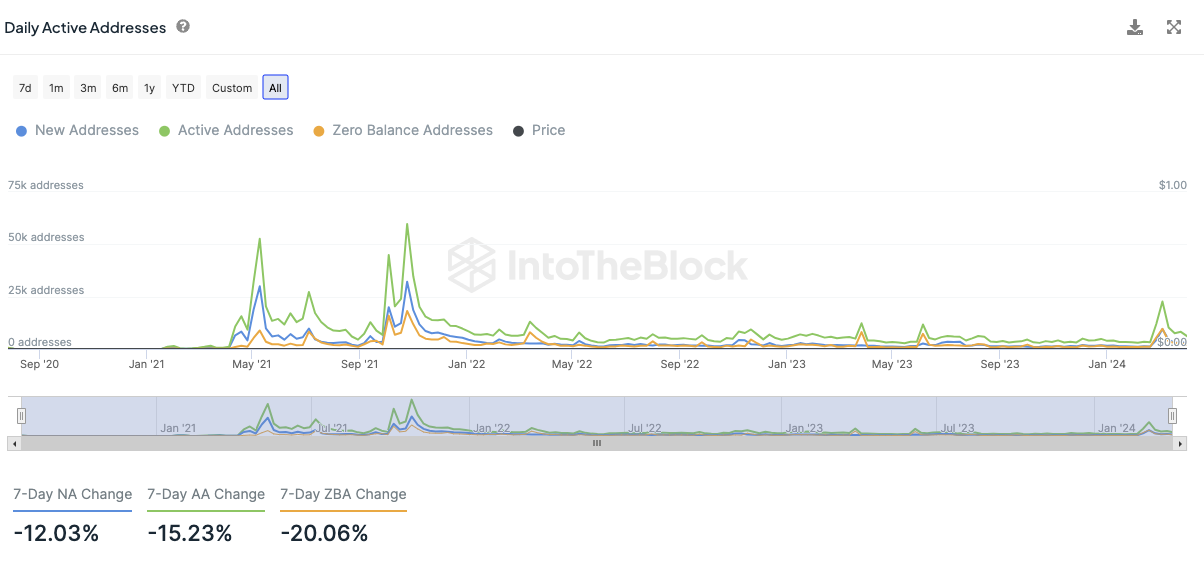 Die Aktivität im Shiba Inu Netzwerk geht dennoch weiterhin zurück. So ging der Anteil an neuen Adressen um knapp 12 % zurück, wohingegen der Anteil an aktiven Adressen sogar um 15 % geschrumpft ist.