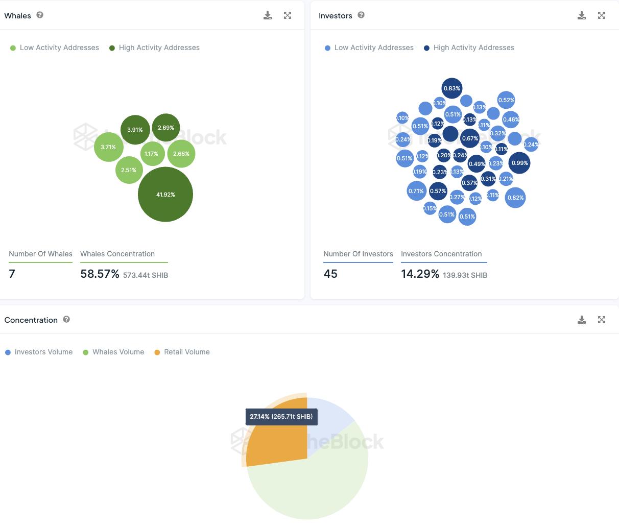 Konkret verfügen etwa 45 institutionelle Investoren über fast ein Viertel aller umlaufenden SHIB Tokens. Sieben Wale-Adressen kontrollieren fast die Hälfte aller im Umlauf befindlichen Tokens.