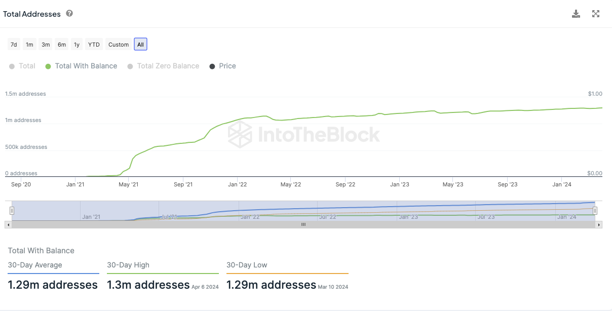 Das Wachstum der Gesamtanzahl an Shiba Inu Adressen mit SHIB Guthaben befindet sich in einer Stagnationsphase. In den letzten 30 Tagen wurden im Durchschnitt 1,29 Millionen Shiba Inu Adressen mit einem SHIB Guthaben gezählt.