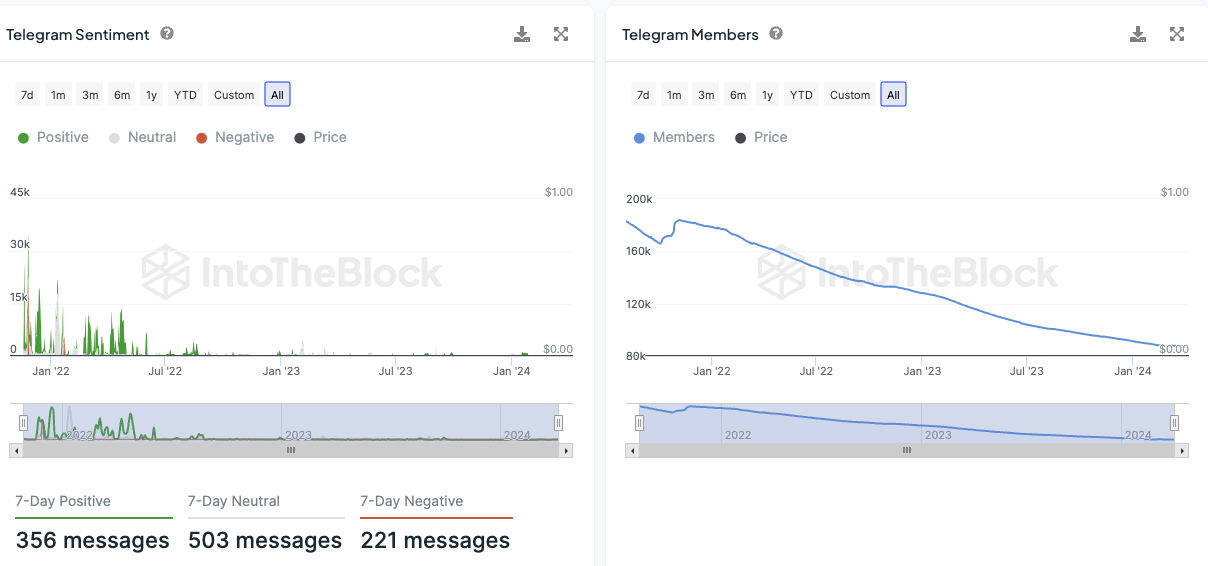 Die Stimmung auf Telegram gegenüber Shiba Inu ist eher positiv, mit einem Überschuss an positiven Nachrichten (356) im Verhältnis zu negativen Beiträgen (221). Die Anzahl an Telegram-Gruppen Mitgliedern befindet sich dabei in einem starken Abwärtstrend.