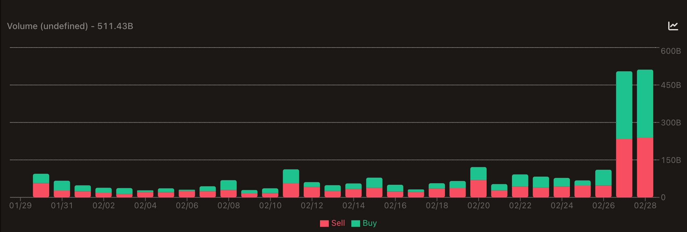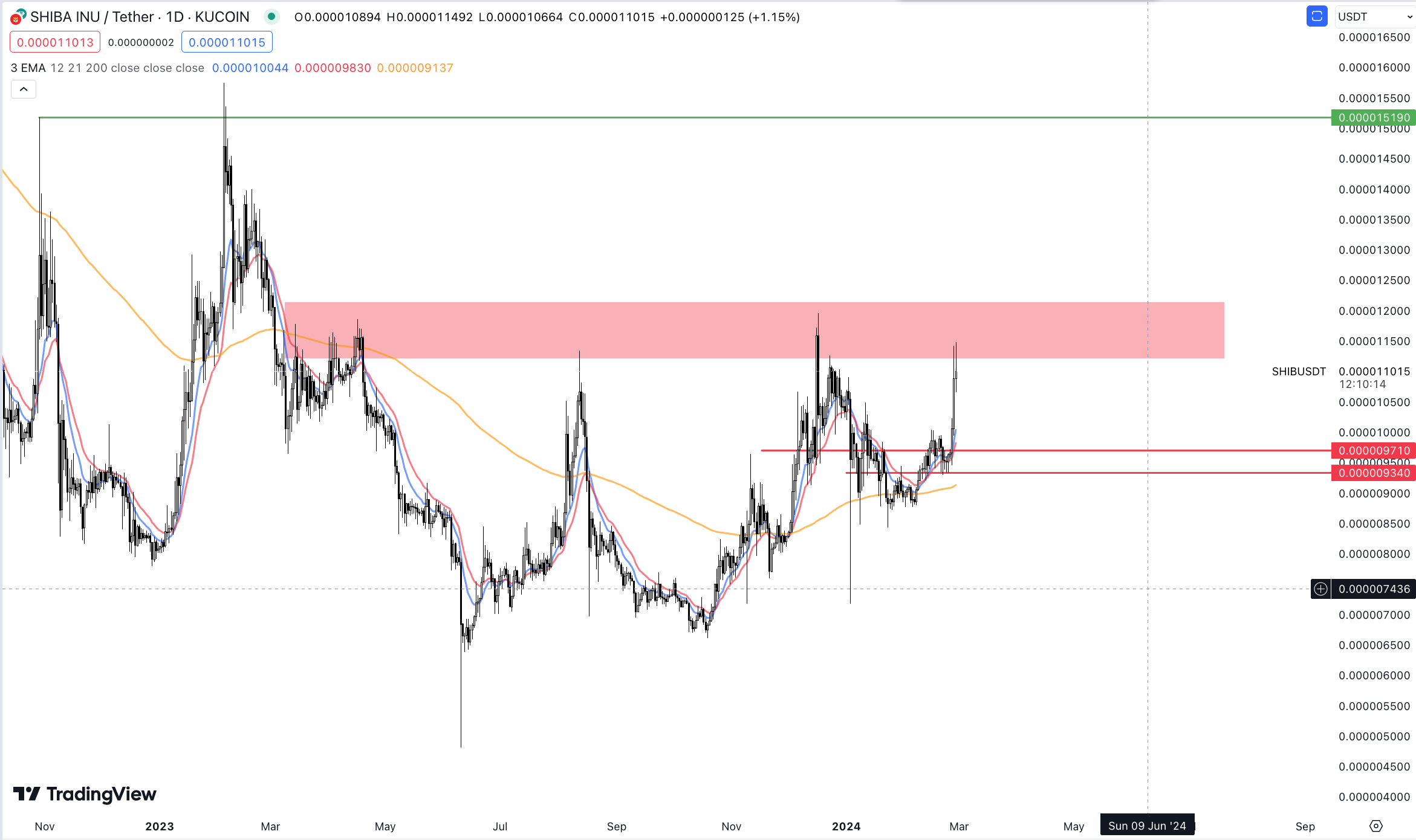 Am 27. Februar schließlich verzeichnete der Kurs eine impulsive Aufwärtsbewegung um 8 Prozent von 0,000010070 auf 0,00001089 USD. Zusammen mit diesem Anstieg legte das Handelsvolumen fast eine Verfünffachung hin und stieg von 110,48 Milliarden auf aktuell 511,43 Milliarden SHIB an.