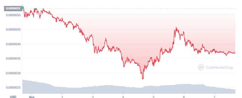 Wie wir der Shiba Inu Kurs Chart entnehmen können, fällt der SHIB Preis seit Beginn November sukzessive. Zwar ging es am 4. November mit einer leichten Aufwärtstendenz weiter, doch konnte der SHIB Kurs dieses Niveau nicht halten und bewegt sich entsprechend seit einem Tag in einer wenig aufregenden Seitwärtsbewegung.