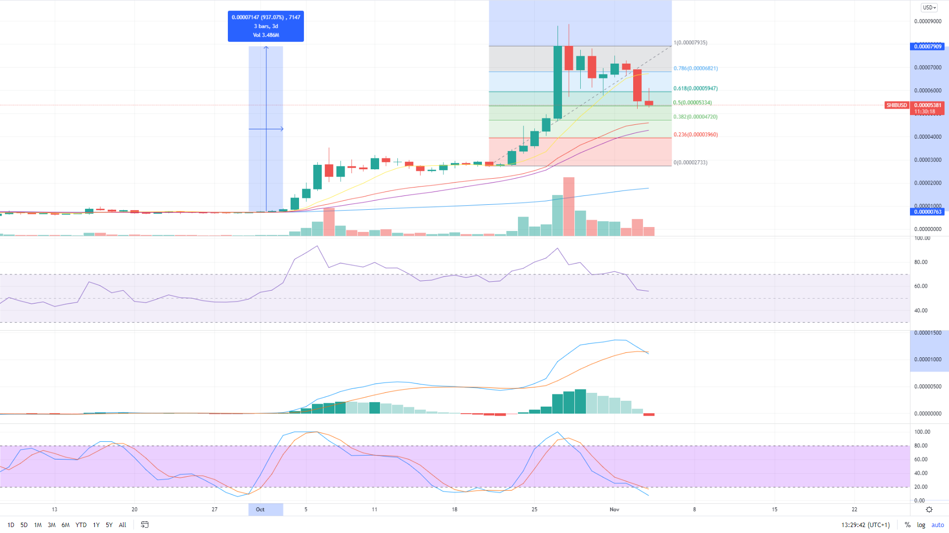 Der SHIB Kurs konnte sich seit Ende September fast verzehnfachen. Darum war nach dem Hype mit einer Korrektur zu rechnen. Die fallenden technischen Indikatoren und das bearish Cross auf dem MACD deuteten bereits auf einen möglichen Kursabstieg hin. Außerdem ist der Kurs unter das externe 0.618-Fib-Retracement-Level gefallen. Der Trend ist somit bärisch.