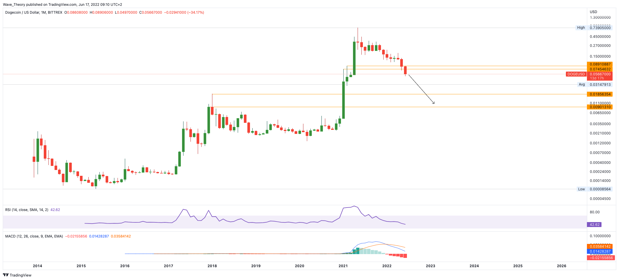 Der Rivale Dogecoin durchbrach nun die Unterstützung zwischen 0,074 – 0,087 USD, womit DOGE nun zur Unterstützung zwischen 0,009 – 0,019 USD korrigieren könnte.