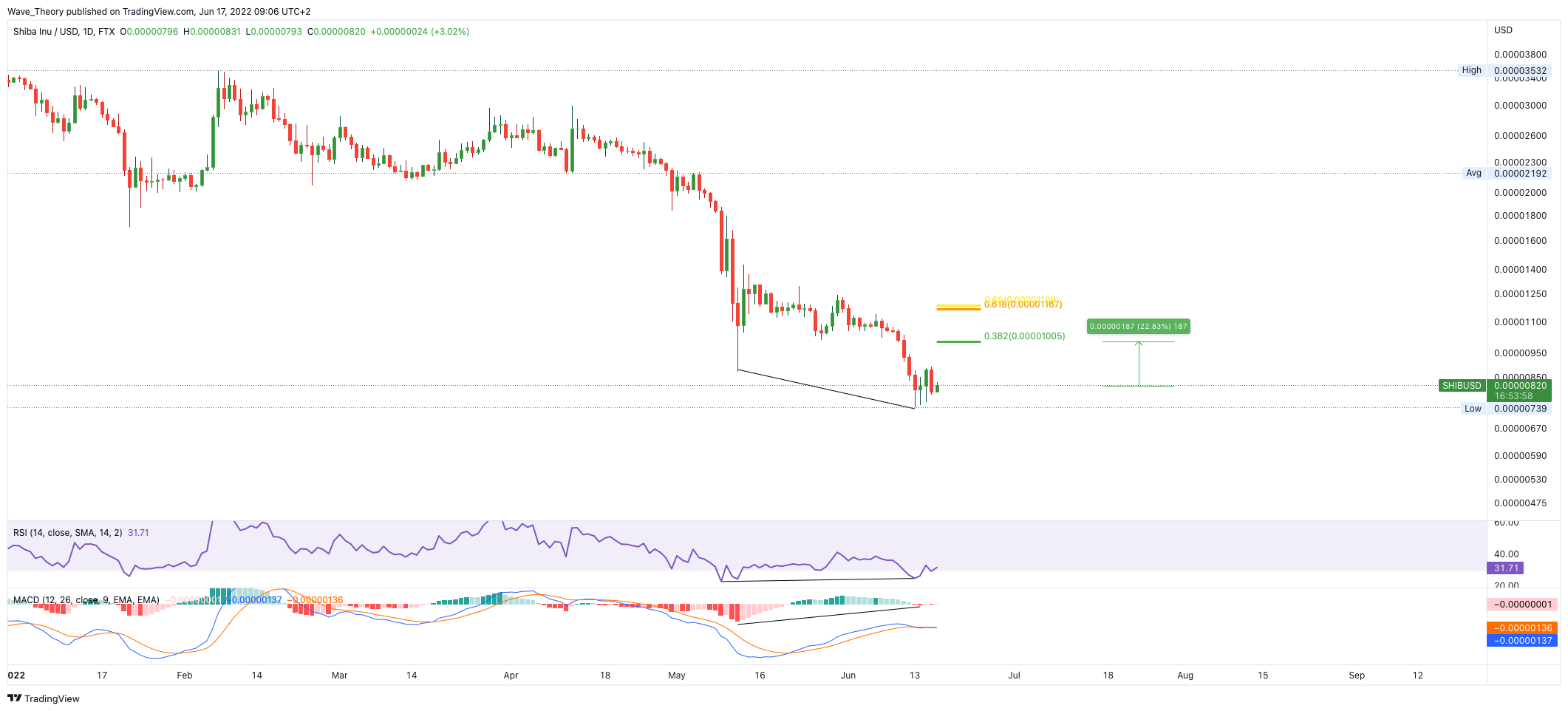 Der SHIBA INU Kurs könnte jetzt steigen, denn er weist eine bullische Divergenz im RSI und Histogramm des MACDs im Tageschart auf. Zudem tickt das Histogramm des MACDs bereits bullisch höher, während sich die MACD Linien schon bald bullisch überkreuzen könnten.