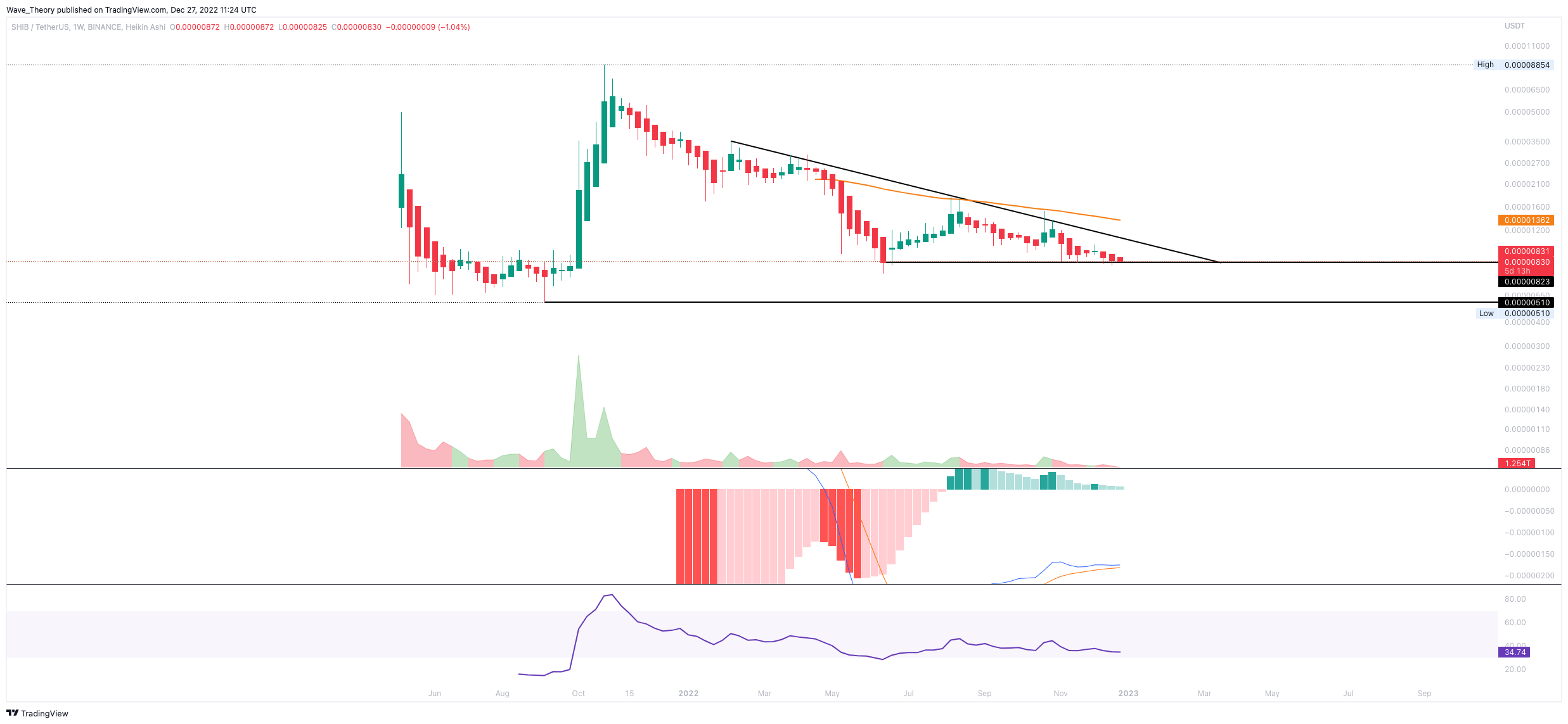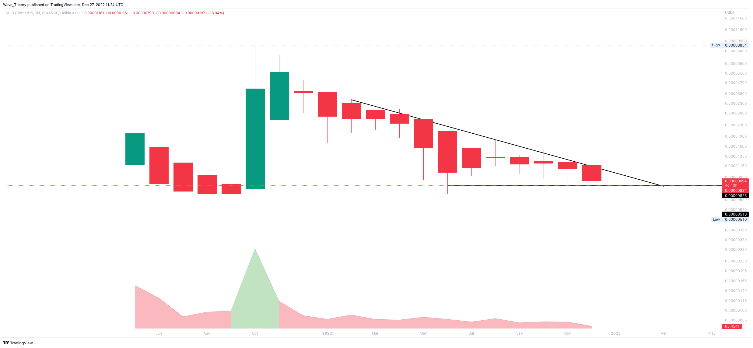Im Monatschart wird ersichtlich, dass das Handelsvolumen weiterhin austrocknet. SHIB könnte mittelfristig zum 2021-Tief bei rund 0,0000051 USD korrigieren.