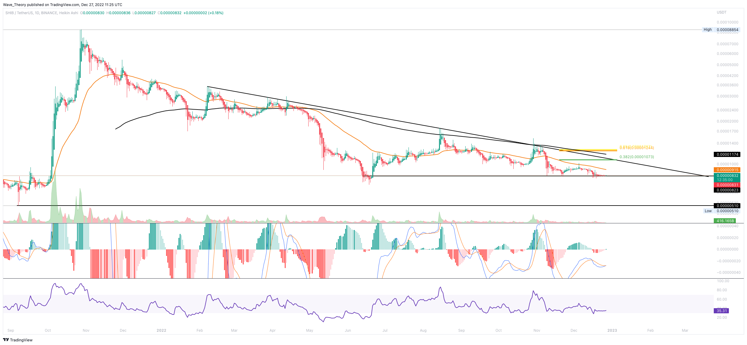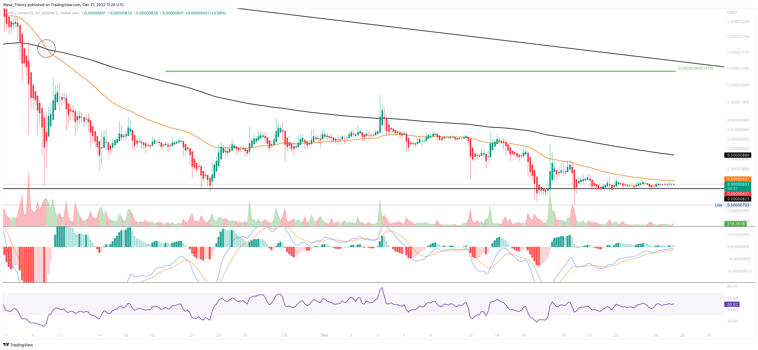 Seit einigen Tagen fungiert der 50-4H-EMA als unüberwindbares Hindernis, welcher bereits bei rund 0,00000837 USD als signifikanter Widerstand fungiert.