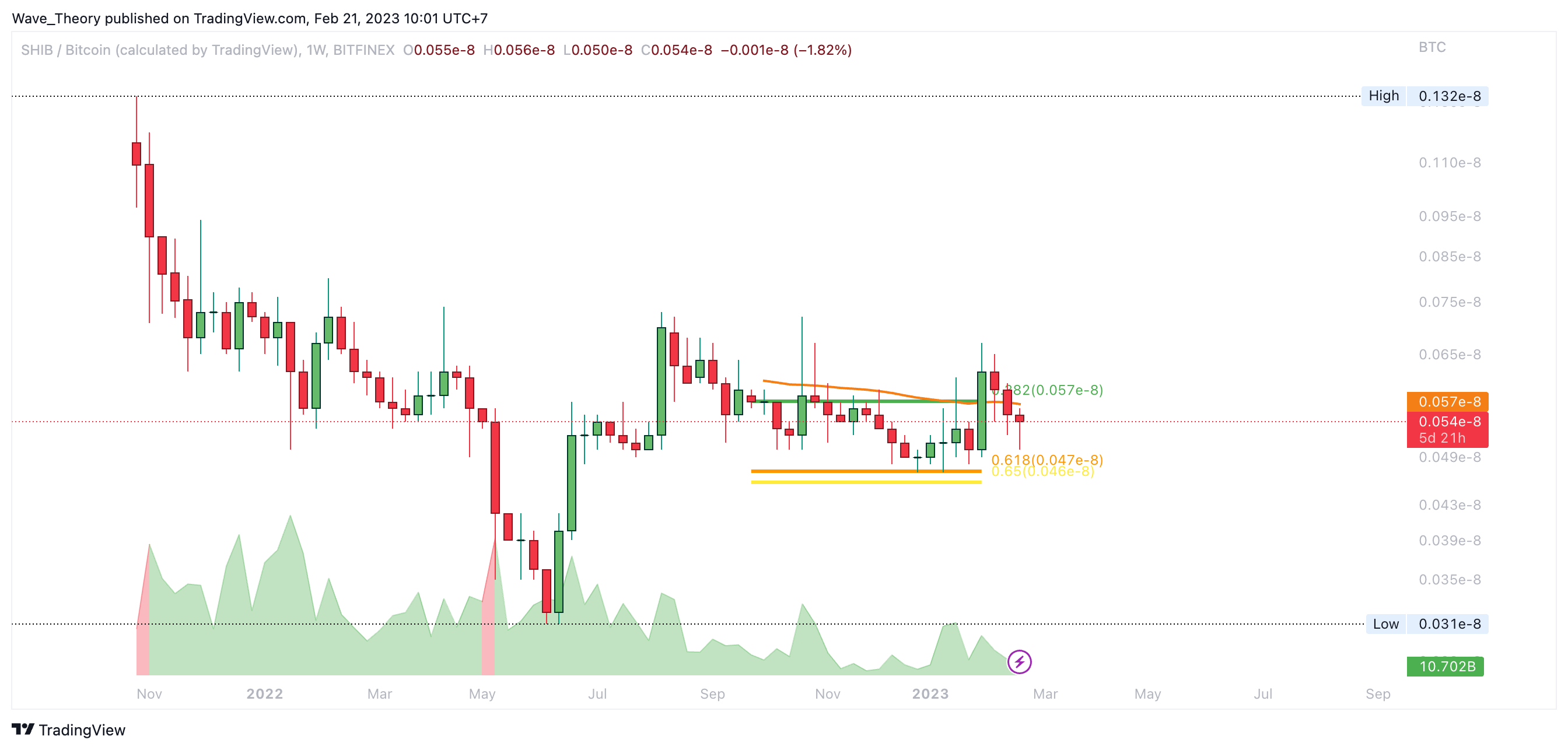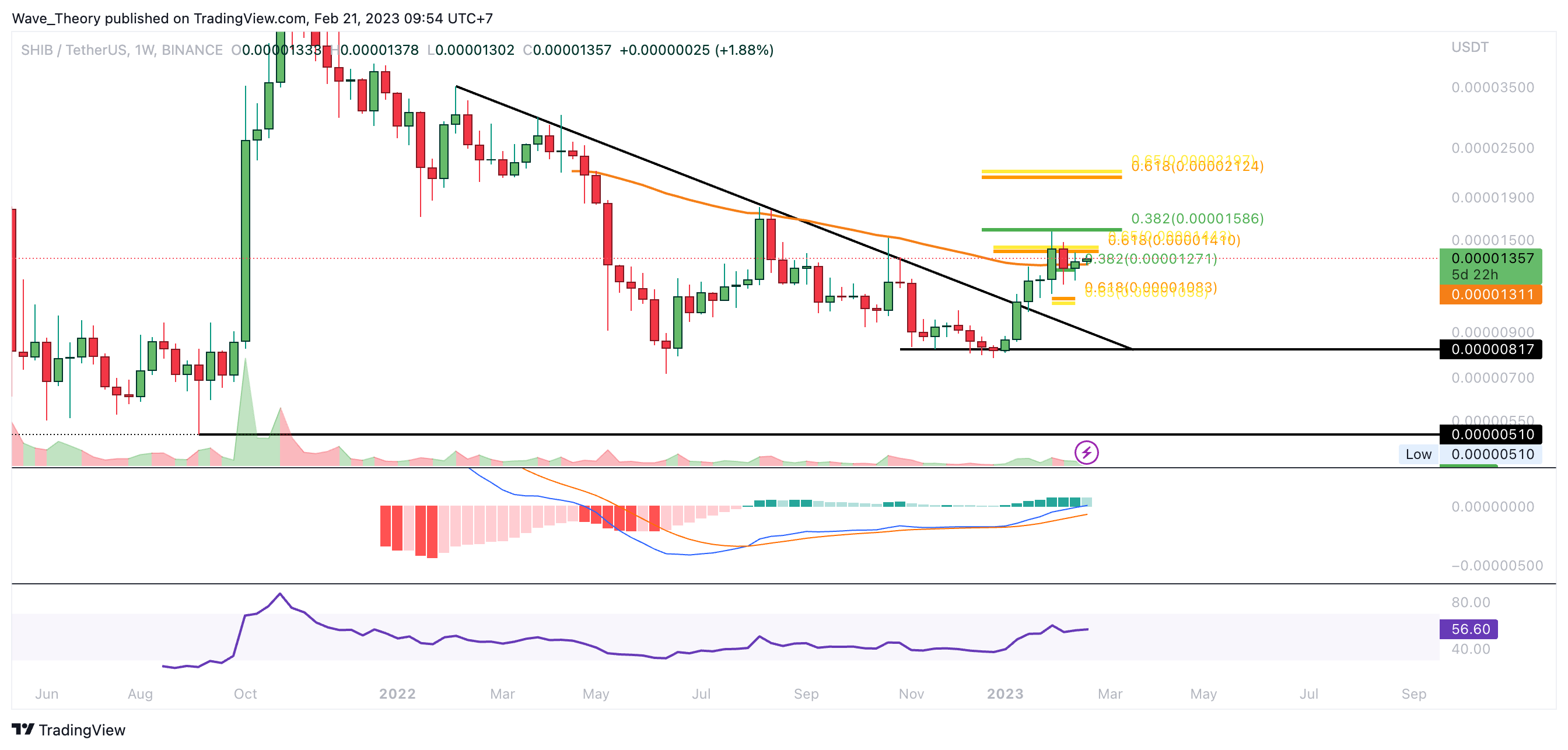 Anschließend kehrte Shiba Inu zur 0,382 Fib Unterstützung bei rund 0,0000127 USD zurück und prallte daran ab. Dort fungiert zudem der 50-Wochen-EMA als zusätzliche Unterstützung.