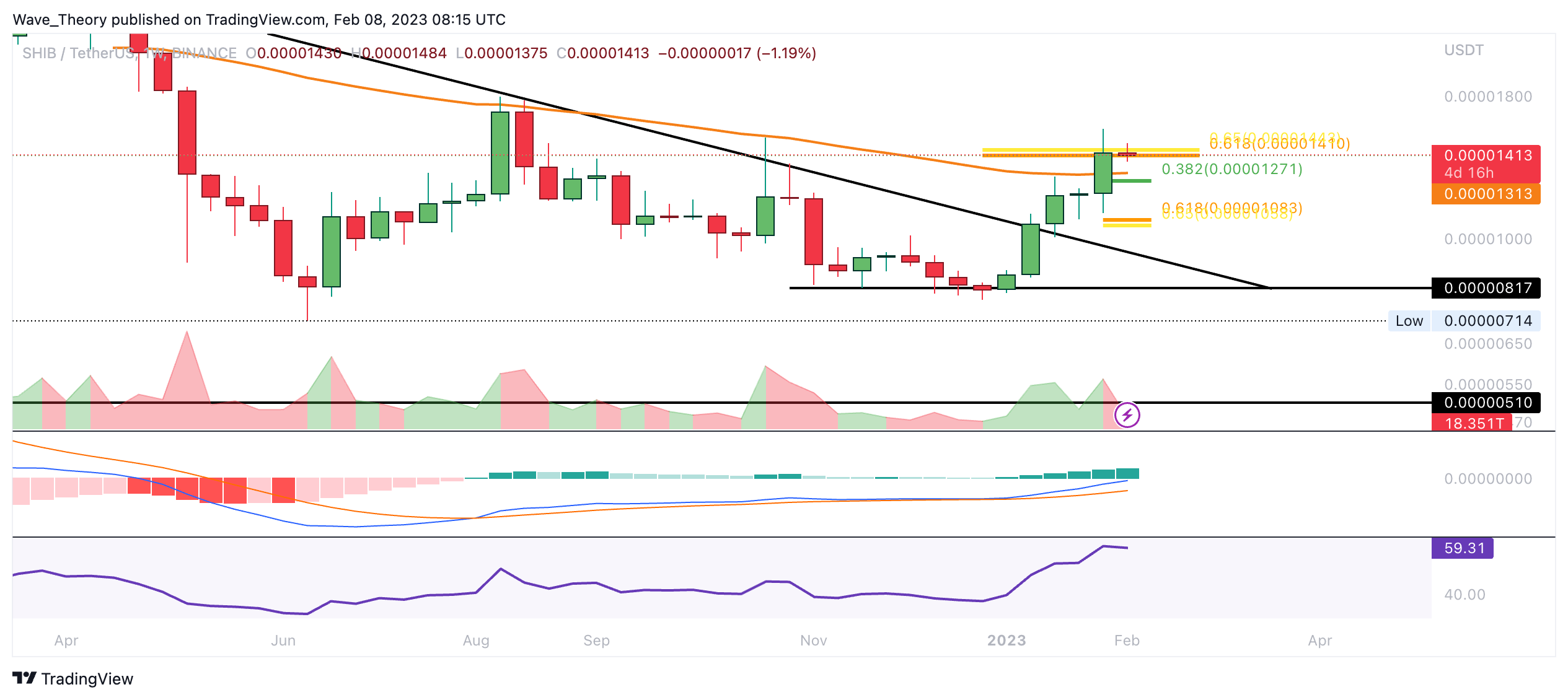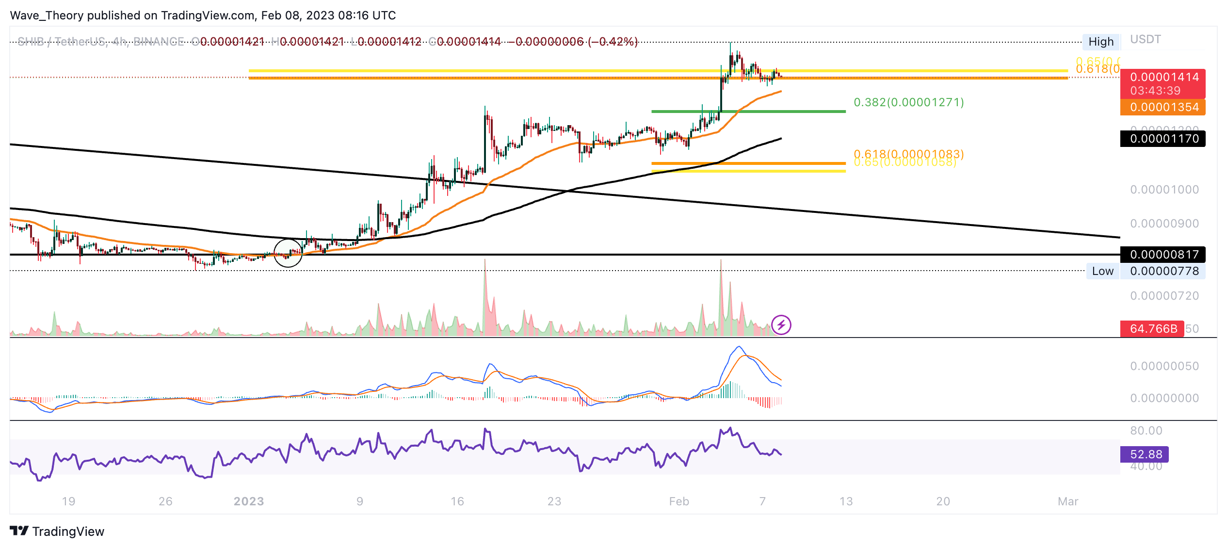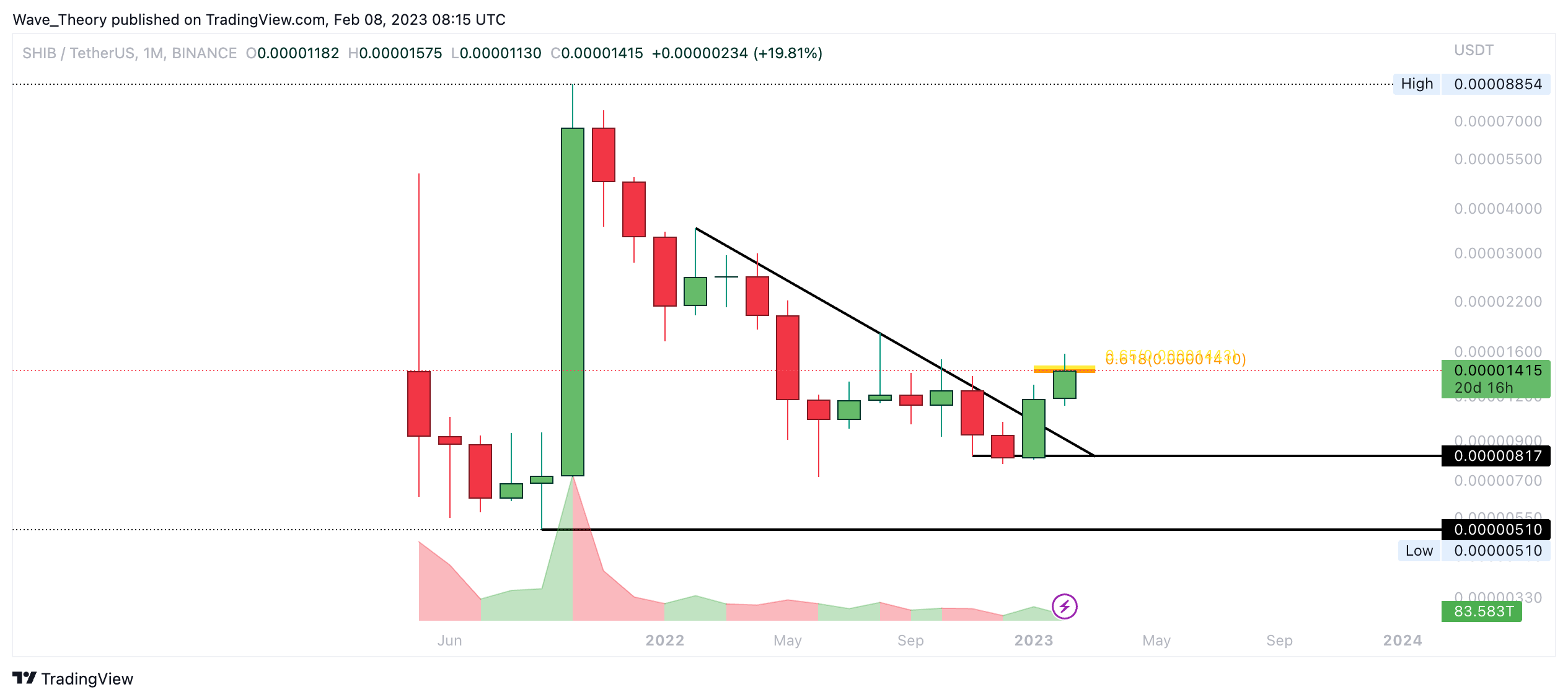 Der Shiba Inu Kurs konnte an der Unterstützung zwischen rund 0,0000051 USD und 0,00000823 USD bullisch abprallen und dabei sogar eine “Bullish-Engulfing-Candle” im Monatschart formen. Insgesamt konnte Shiba Inu seit dem Tiefpunkt am 28. Dezember über 100 % in die Höhe schießen.