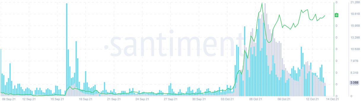 Der stärkste Wachstumsschub in Hinblick auf den SHIB Kurs scheint vorerst vorbei zu sein. Allerdings ist das Interesse an dem Coin immer noch hoch, wie die Daten von Santiment uns zeigen. Hier sehen wir neue Höchststände bezüglich des Interesses auf sozialen Plattformen, die auch nach dem Allzeithoch bestehen bleiben.