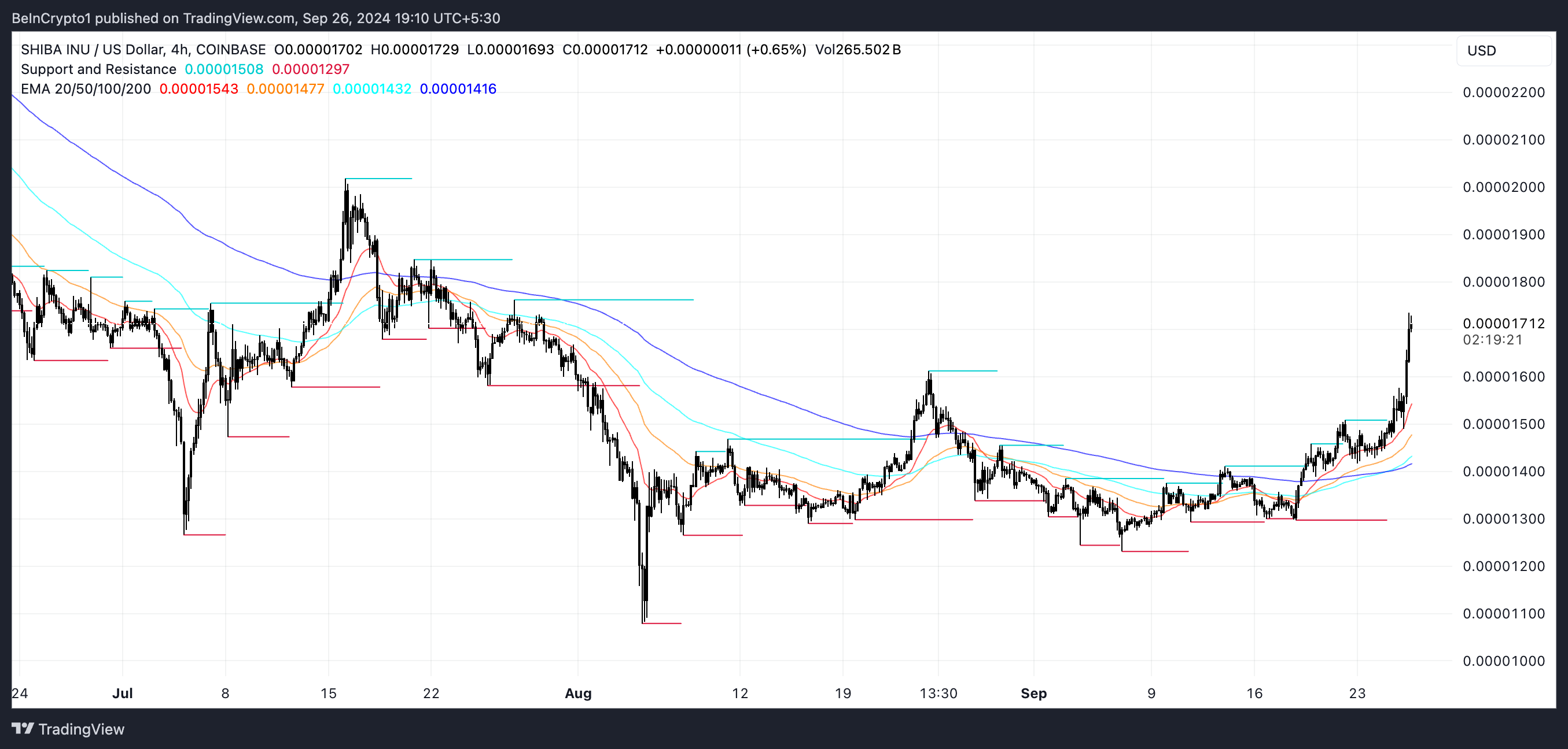 SponsoredObwohl die EMA-Linien von Shiba Inu vielversprechend aussehen und auf eine mögliche Fortsetzung des Aufwärtstrends hindeuten, befinden sich davor starke Widerstandsniveaus bei 0,0001763 USD und 0,0001846 USD. Diese Widerstandsbereiche waren in der Vergangenheit starke Barrieren für SHIB.